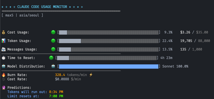 alias claude-monitor='cd ~/path/to/Claude-Code-Usage-Monitor && source venv/bin/activate && ./claude_monitor.py --reset-hour 9 --plan max5 --timezone Asia/Seoul'