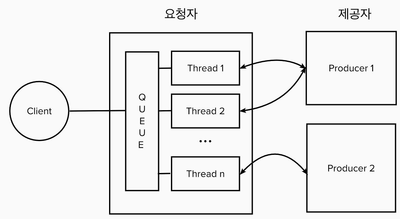 Client로부터 Request를 받을 때마다 Queue에 쌓이고, 가용 가능한 쓰레드가 있으면 해당 쓰레드에 Queue에 등록된 Request를 할당하여 처리하는 방식이다.