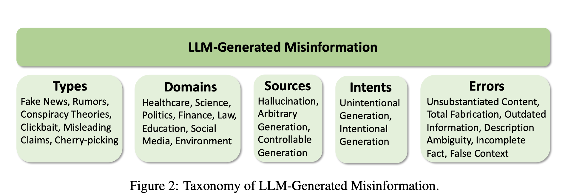 저자들은 논문에서 LLM 이 여러 종류, 도메인, 에러의 misinformation 을 발생시킬 수 있다고 말하며 LLM-generated misinformation 을 taxonomize 하고 있습니다.