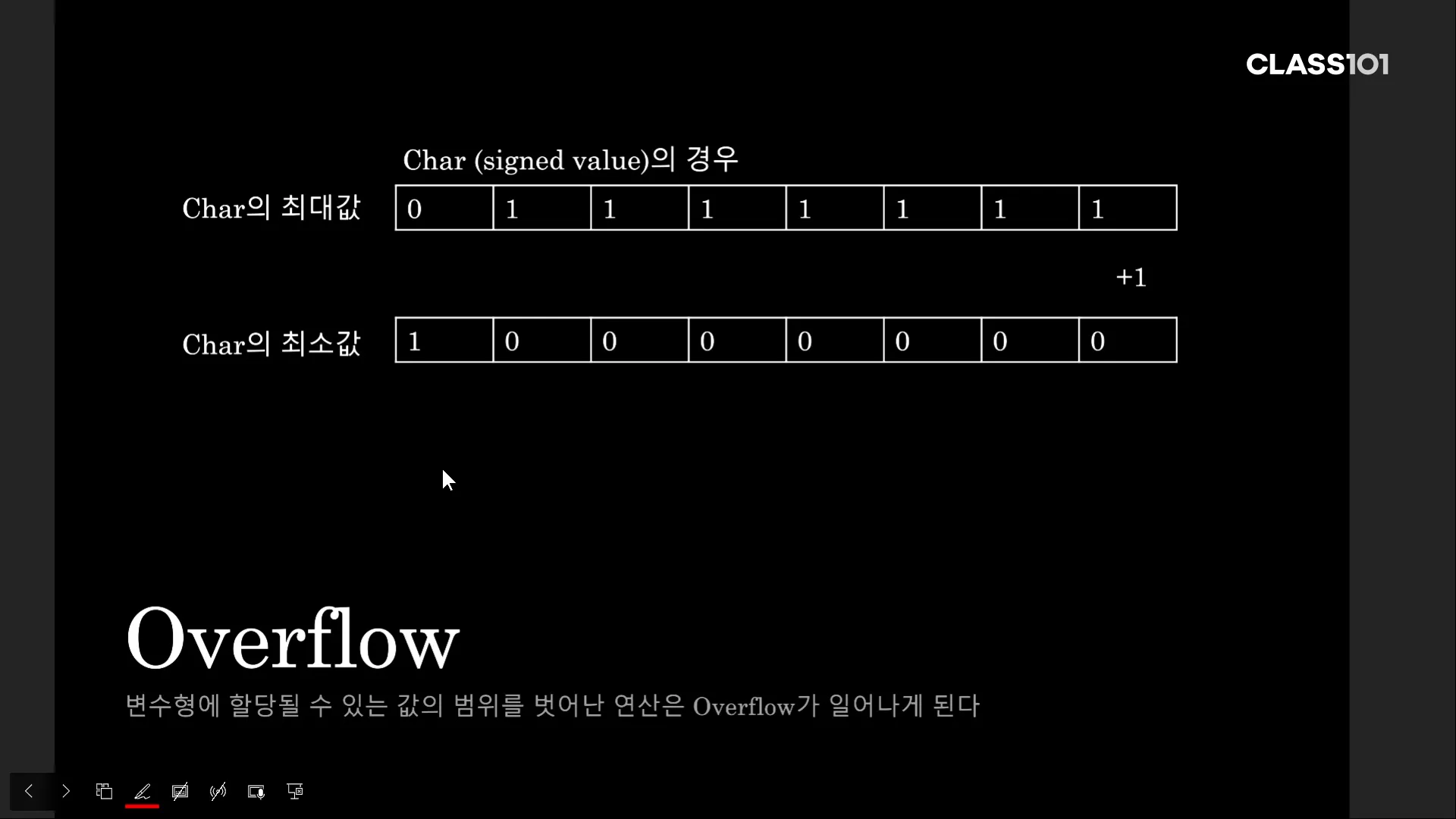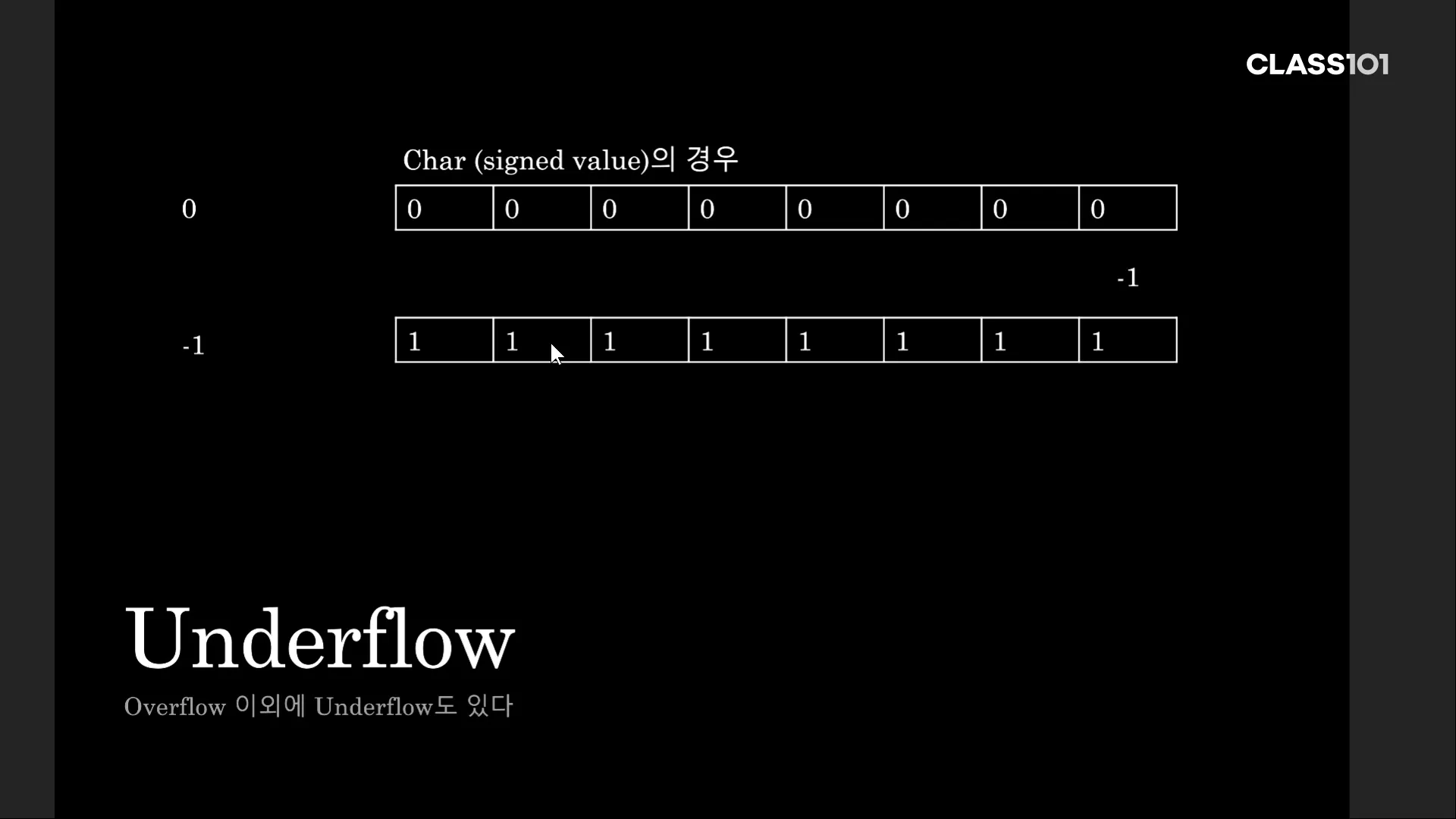 - 언더플로는 가장 낮은 숫자가 더 낮은 숫자를 가지려 할 때 일어납니다. 보통 0에서 -1이 되는 과정이 언더플로가 일어나는 과정입니다.