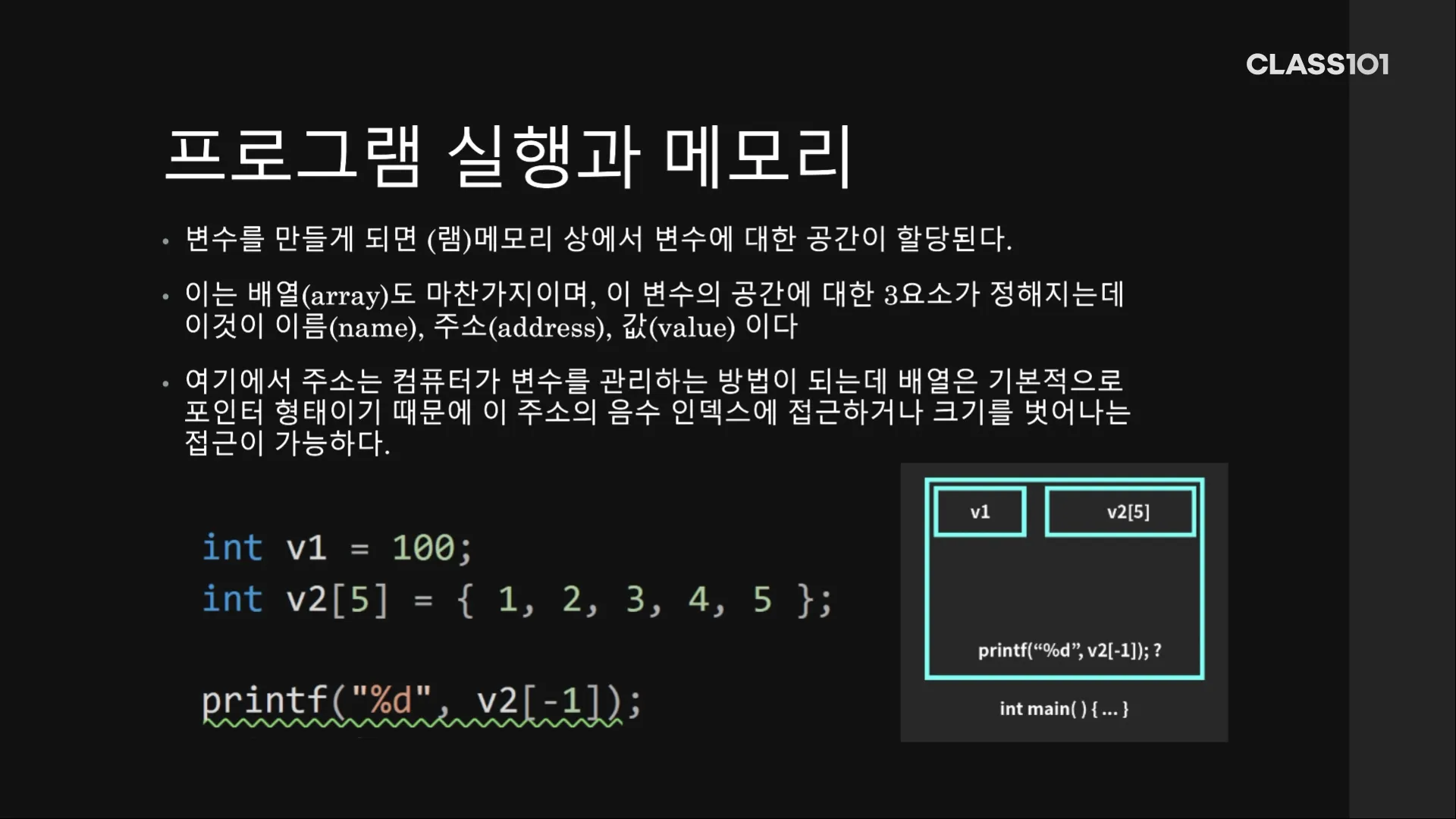 - 프로그램을 실행할 때, 변수 혹은, 배열을 사용할 때, 주소값이 어떻게 되는지 정확하게 이해하고 있어야 합니다.