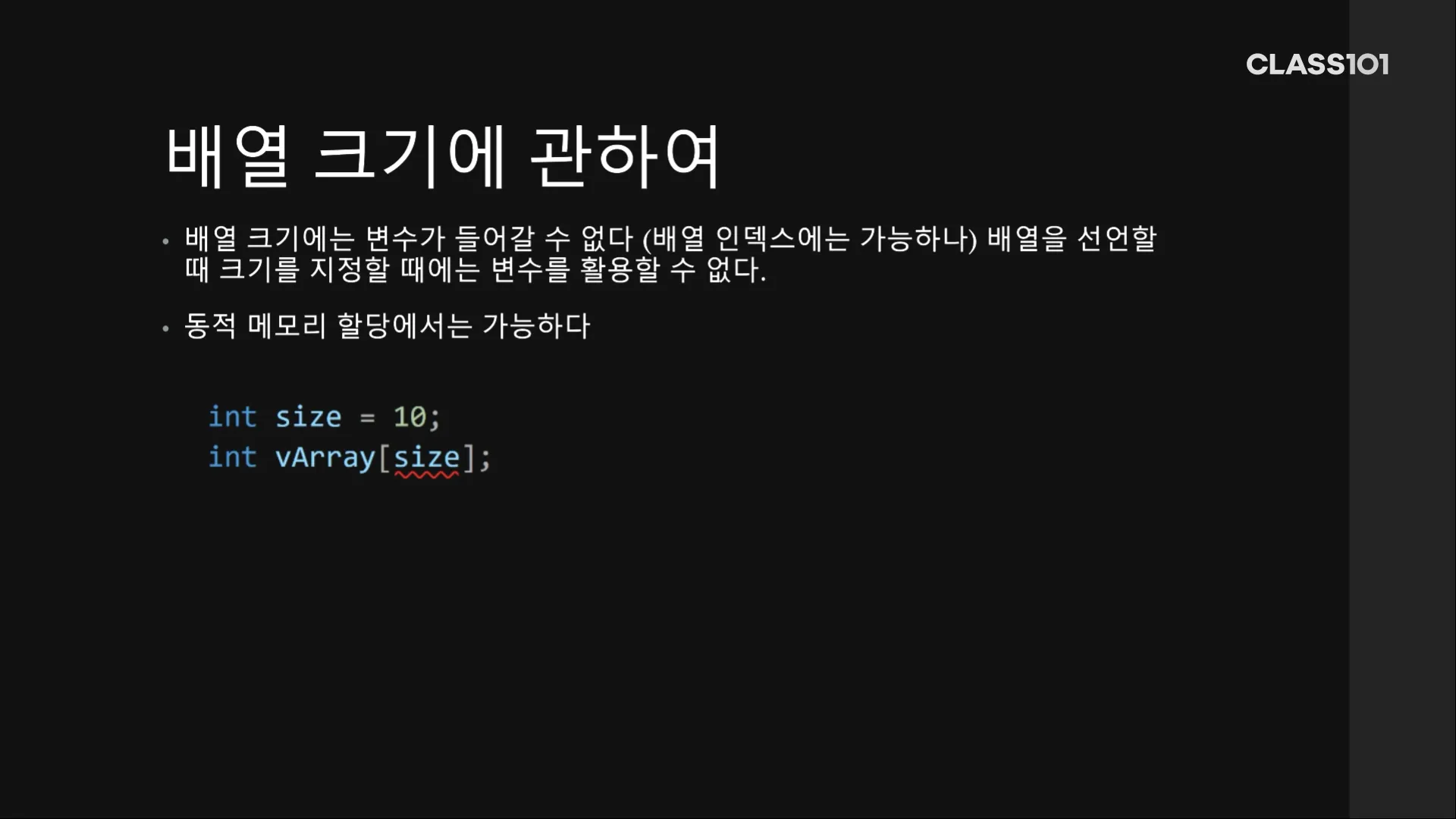 - 배열을 생성할 때의 크기를 집어넣는 곳에는 변수가 들어갈 수 없습니다. 이는 본래 프로그램은 그런 방식으로 이루어져 있기 때문입니다. 다른 언어에서 이것이 가능한 것은 다른 언어에서는 malloc 이라는 동적 메모리 할당을 자동으로 하기 때문입니다.