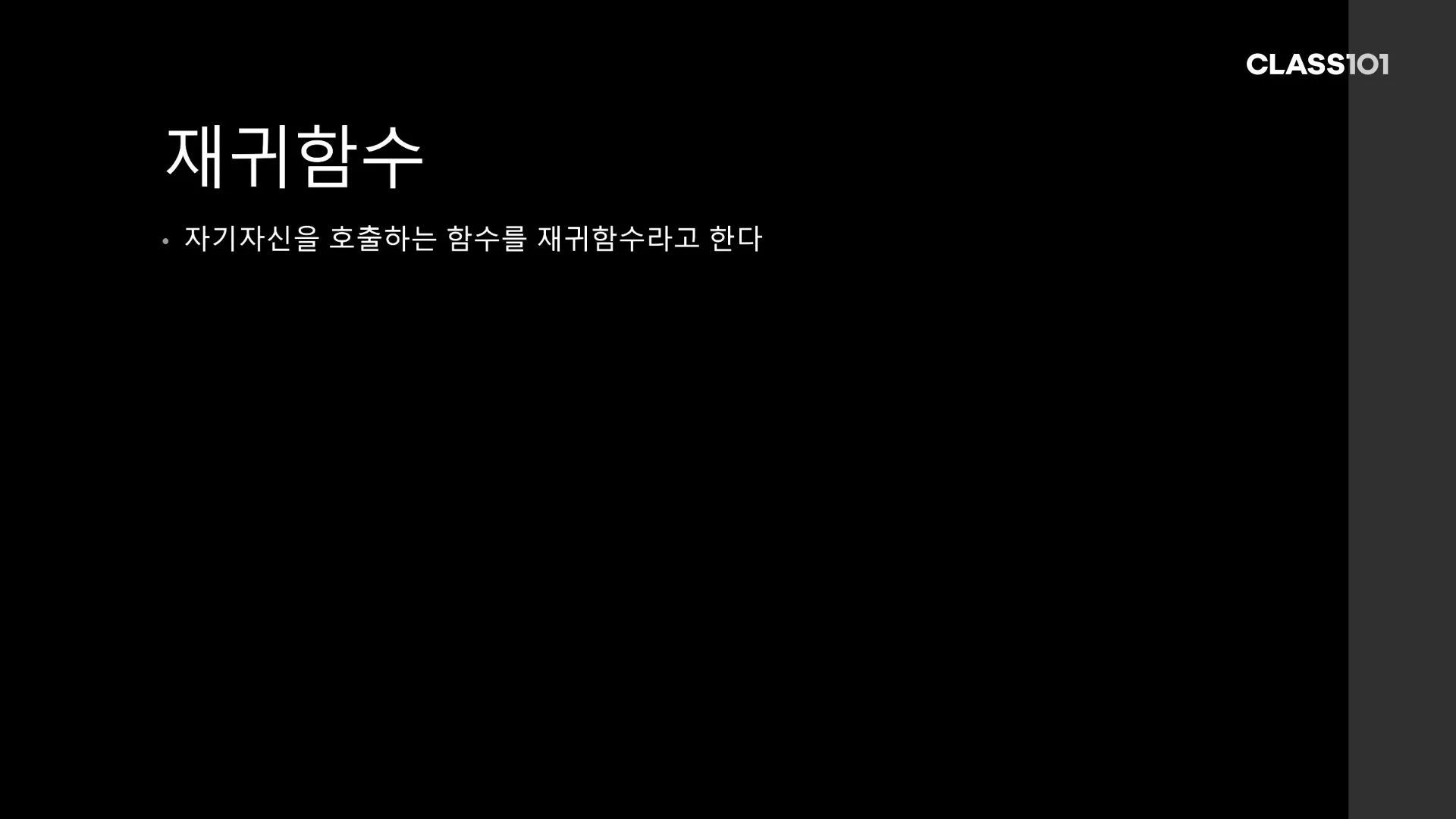 - 재귀함수는 자기 자신을 호출하는 함수를 재귀함수라고 합니다.재귀함수를 활용하는곳은 극히 드물지만 대학이나 알고리즘을 배우게 되면 꼭 한번은 나오게 되는 내용입니다.이 내용을 굳이 완벽하게 다룰 필요는 없지만 이 개념이 어떻게 활용되는지는 이해하고 있어야 합니다. 일반적으로 개발을 할 때에는 재귀함수를 사용하는 일이 별로 없습니다만 알고리즘적인 개발을 할 때에는 재귀함수를 많이 사용하게 됩니다.