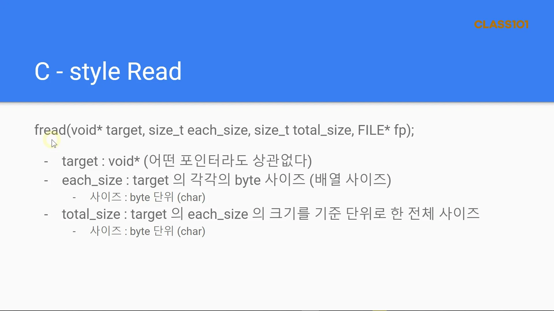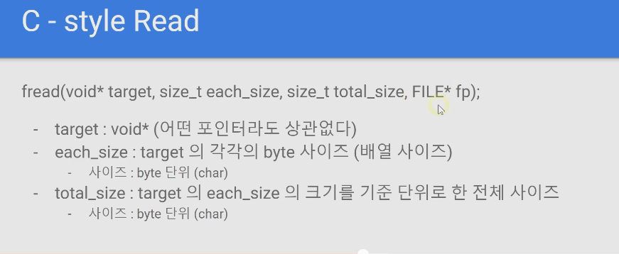 - fread는 일반적으로 binary형태로 파일을 읽어올 때 가장 많이 사용하는 함수중 하나로 포인터에 파일에서 입력될 실제 값의 byte수를 지정하고 파일포인터를 마지막에 입력받아 해당 포인터에 파일포인터에서 읽어온 byte 값 만큼을 binary 형태로 읽어오게 됩니다.
