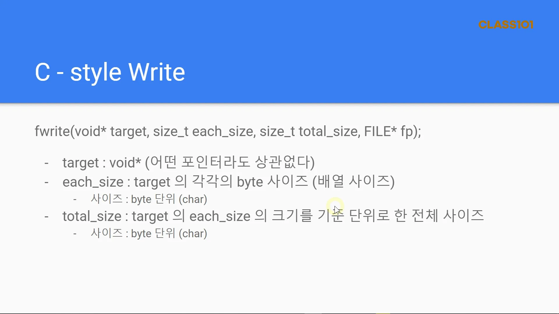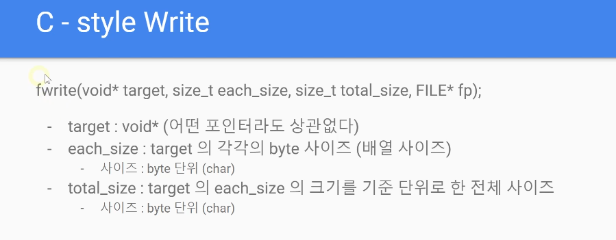 - fwrite는 일반적으로 파일을 저장할 때 가장 많이 사용하는 함수중 하나로 포인터 와 포인터로 입력된 실제 값의 byte수를 지정하고, 파일포인터를 마지막에 입력받아 해당 파일 포인터에 값을 binary형태로 저장하는 함수입니다.