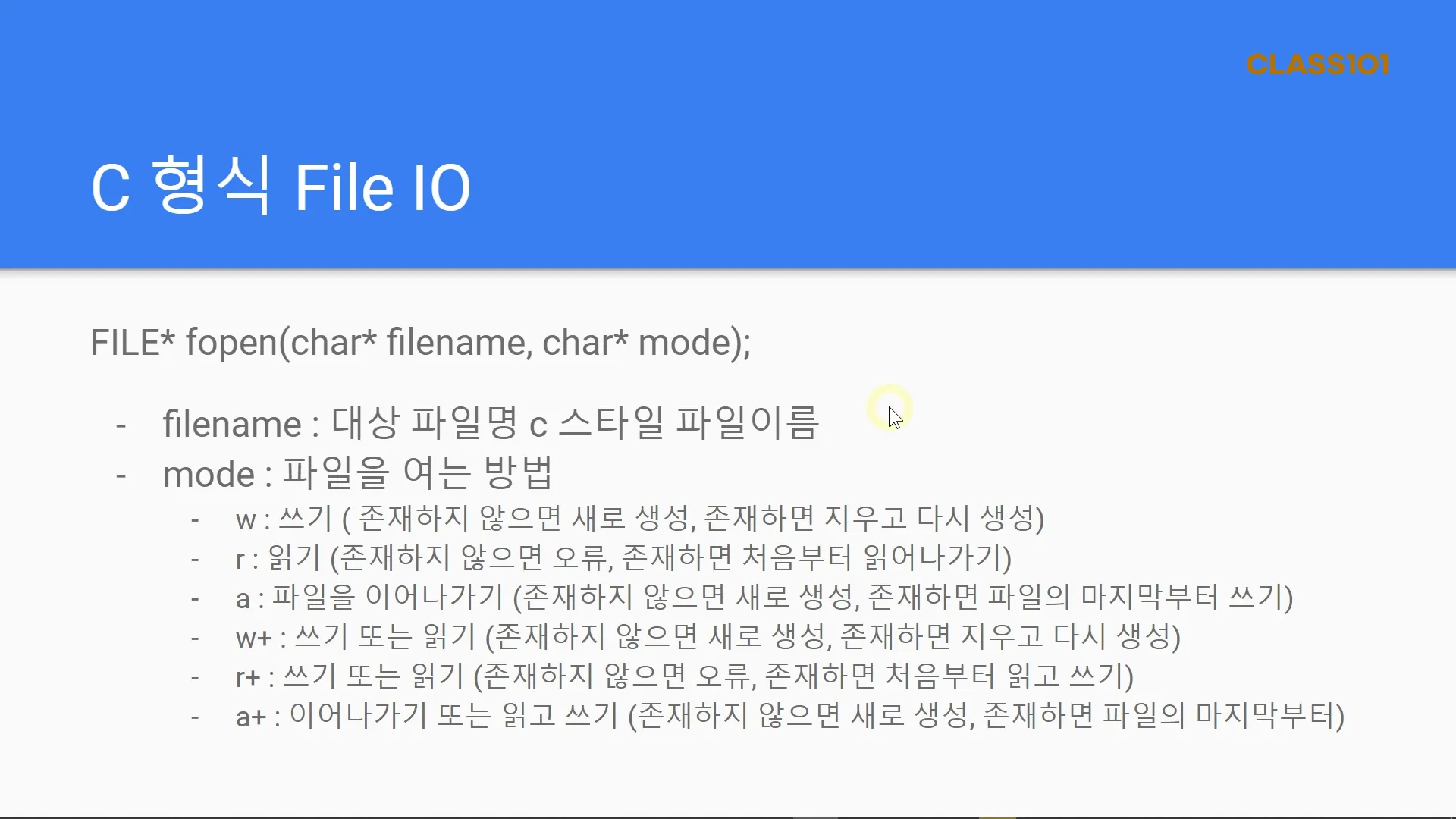 - 우리는 이번시간에 C형식으로 파일을 읽는것을 배웁니다. C형식이라고 해서 특별한 것은 없고 C에서 기본적으로 제공했던 함수를 활용해서 파일 입출력을 한다고 받아들이시면 되겠습니다. C형식으로 하는 이유는 파일 입출력에 한해서는 C++형식의 파일 입출력이 굉장히 복잡하고 배우기 어렵기 때문입니다. fopen에는 여러가지 옵션이 존재하며, 그 중에서 가장 많이 사용되는 옵션은