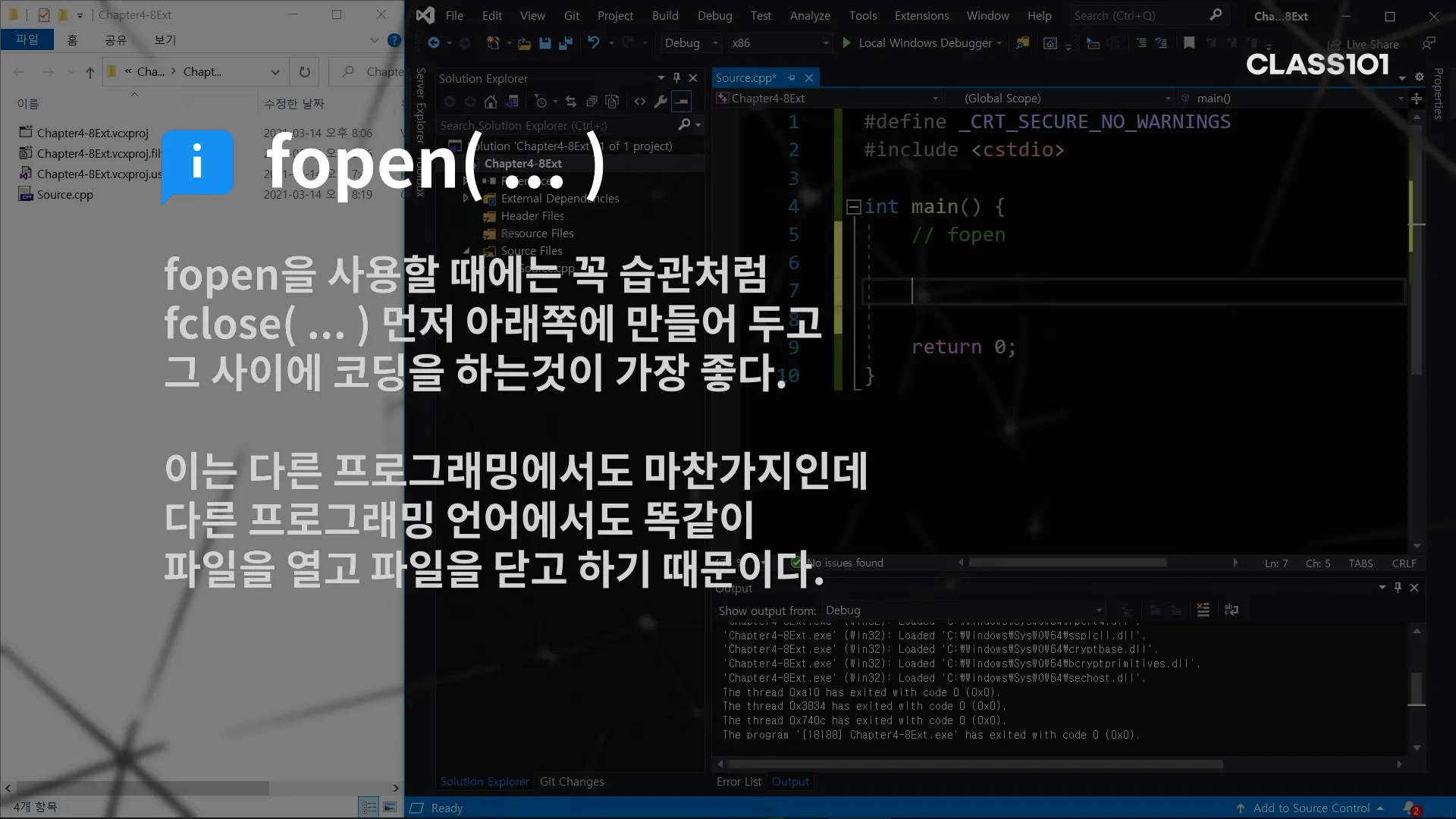 -fopen 함수를 이용할 때는 꼭 습관처럼 fclose 를 아래에 먼저 작성하고 그 안에서 프로그래밍을 해야 합니다. 다른 프로그래밍 언어에서도 마찬가지 형태로 프로그래밍 하는 것을 권장드립니다. 이로 인해 발생할 수 있는 여러 가지 잘못된 런타임 오류를 미연에 방지할 수 있기 때문입니다.