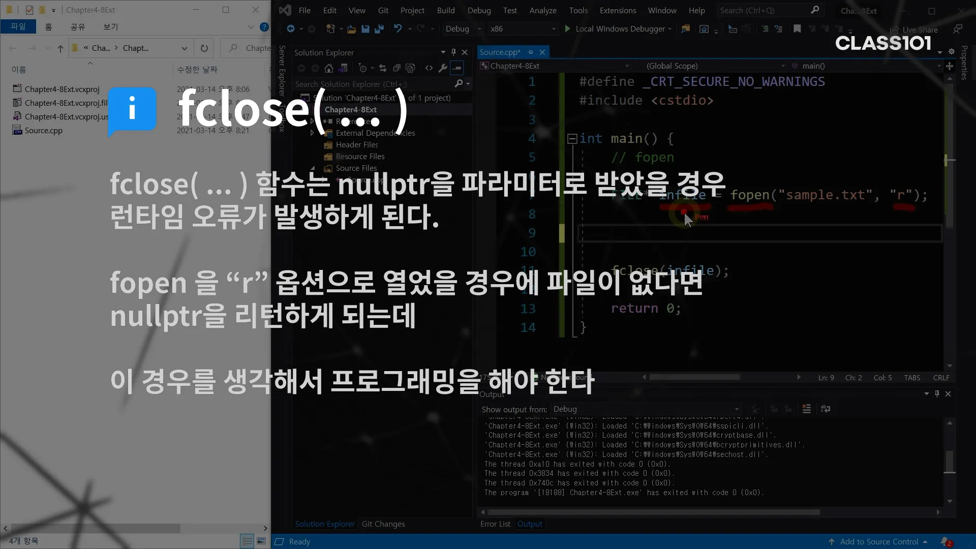 fclose 함수는 nullptr을 파라미터로 받았을 경우(정확히는 올바르지 않은 모든 포인터) 런타임 오류(실행 도중 프로그램이 강제종료가 되는 현상)이 발생합니다. 이런 런타임 오류는 디버그 예외에도 잡히지 않기 때문에 꼭 인지하고 계셔야 합니다. fopen을 이용해 "r" 옵션을 이용해 파일을 열었을 경우, 파일이 없다면 nullptr을 파라미터로 리턴하게 되는데 이 경우에 fclose 함수를 이용해 nullptr을 fclose 할 경우 알 수 없는 오류와 함께 프로그램이 종료되는 경우가 있습니다.