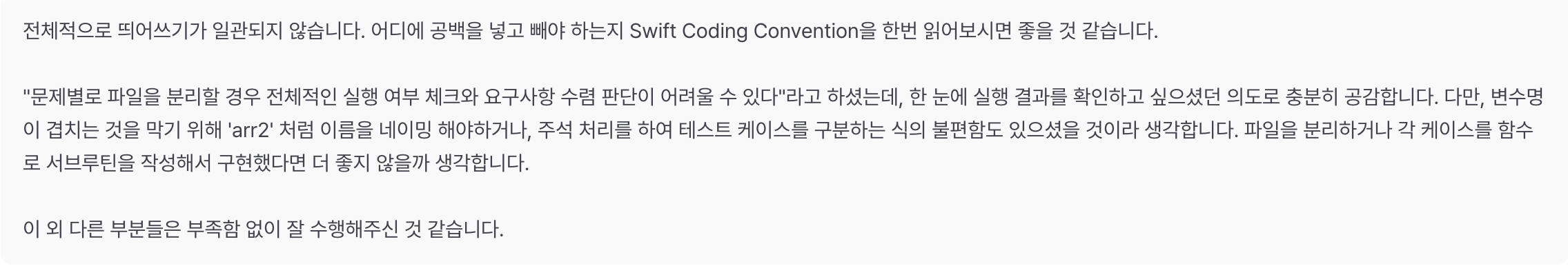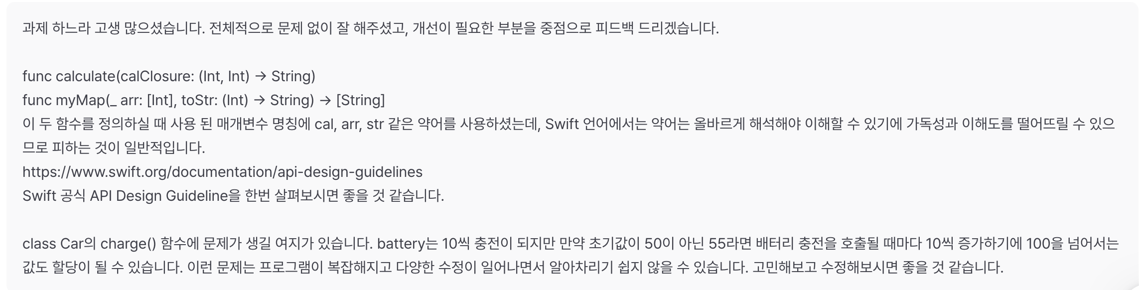 기본적으로, 본인의 코드는 기본적으로 Swift 가이드라인을 준수하지 않고 작성된 느낌을 준다. 튜터님의 피드백 속에도 있듯이, Swift Convention을 읽어보고 이를 정리하여 적용하도록 해야할 것이며 매개변수 명칭에도 약어를 사용하는 좋지 않은 습관?이 존재하는데 첨부하신 링크의 API Design Guideline을 확인하고 적용하도록 하자.