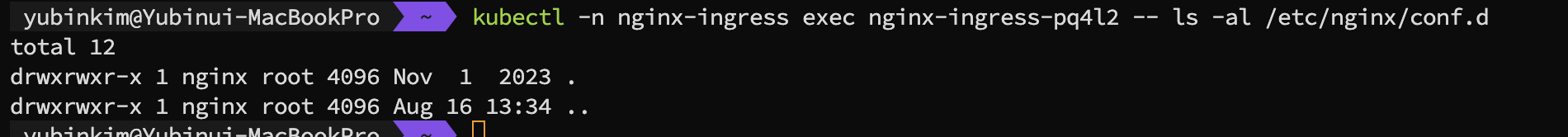 kubectl -n nginx-ingress exec nginx-ingress-pq4l2 -- ls -al /etc/nginx/conf.d