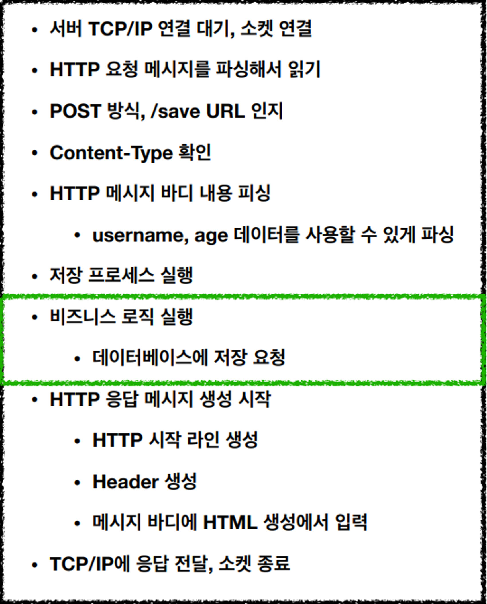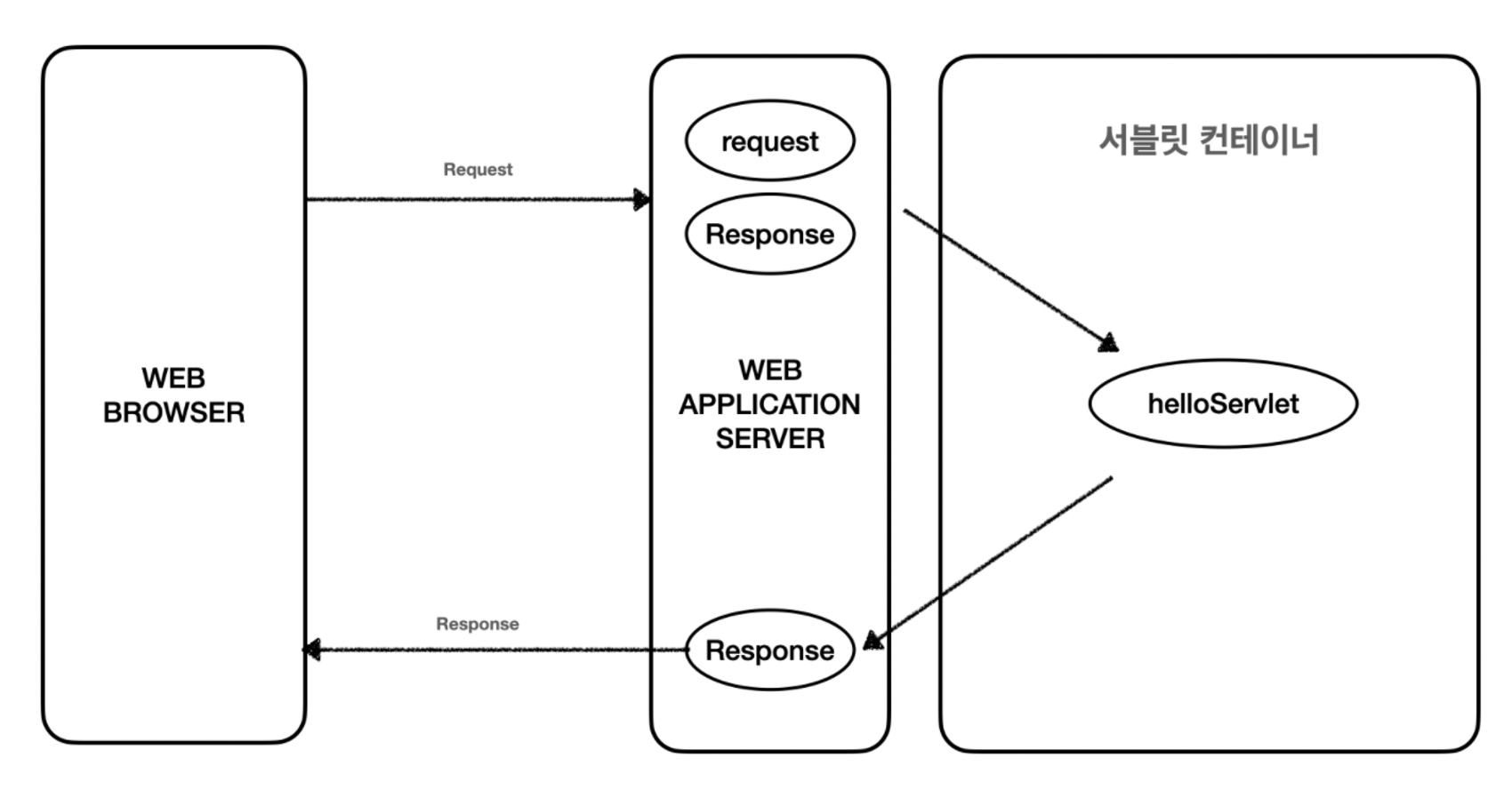 서블릿 컨테이너는 개발자가 비즈니스 로직에 집중할 수 있도록 해당 과정을 모두 자동으로 해준다. 단순히 HTTP 요청 메시지로 생선된 request를 읽어서 비즈니스 로직을 수행하고 response를 반환하면 된다.