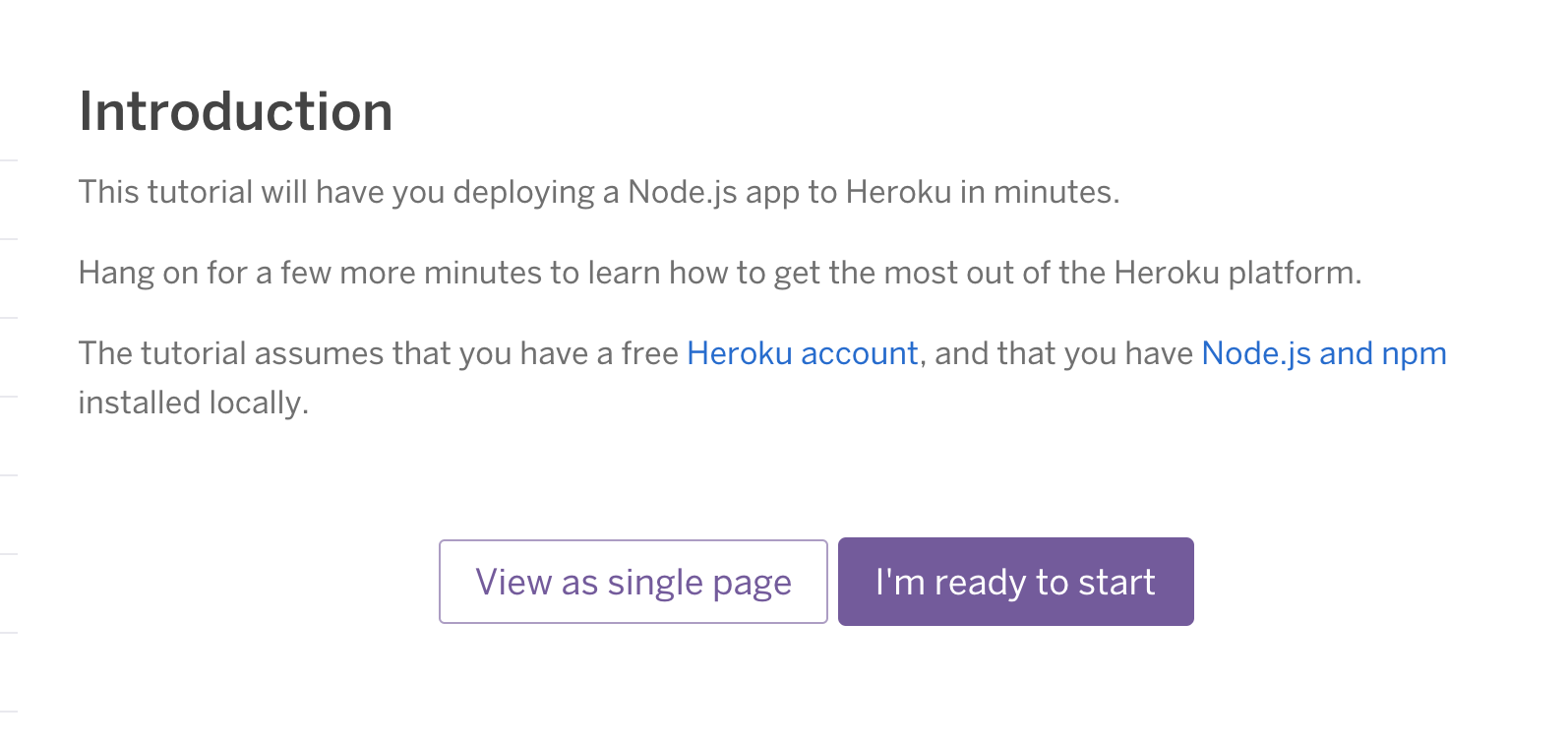 아래 화면처럼 버튼이 있는데 이것을 사용해서 넘어가면서 튜토리얼을 따라가면 nodejs github 하나를 clone해서 heroku에 올리면서 명령어를 익힐 수 있습니다.