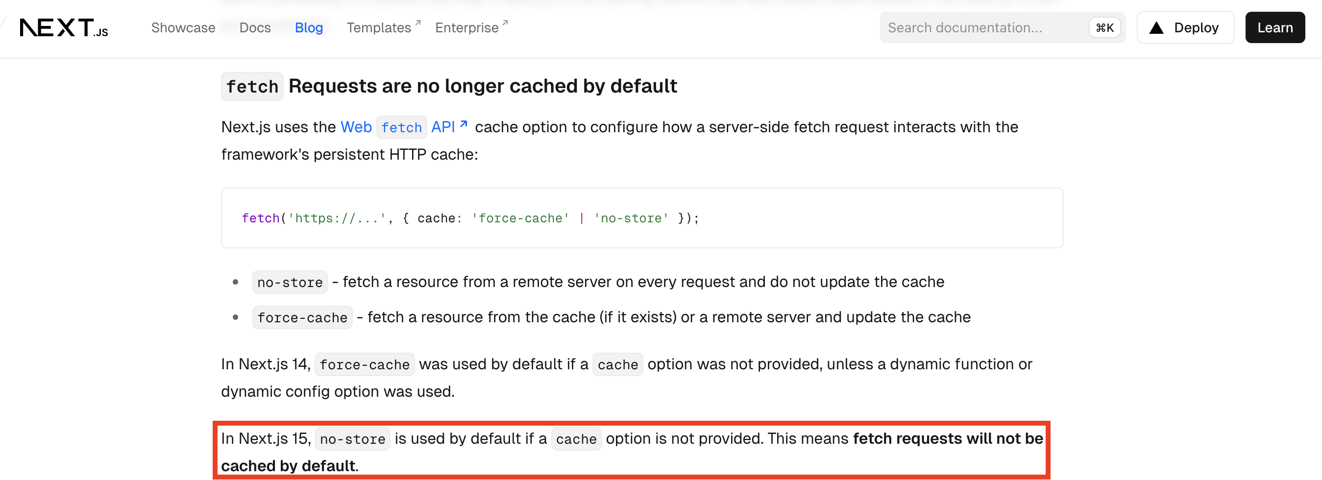 no-store로 변경, 따라서 캐싱이 필요한 경우 force-cache 명시적인 사용이 필요하다.: 브라우저가 요청할 때마다 서버에서 HTML을 생성해서 응답하는 방식으로, Next15의 default fetch option이다.