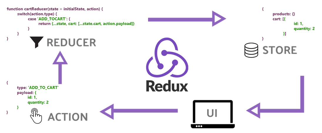 flux아키텍쳐라고 합니다! 데이터 변경의 추적이 쉽기 때문에 개발자 도구에서 값의 변화를 간단히 알 수 있어요.Redux를 쓰기 쉽게 개선한Redux Tool Kit(RTK)도 알아보시면 좋습니다!