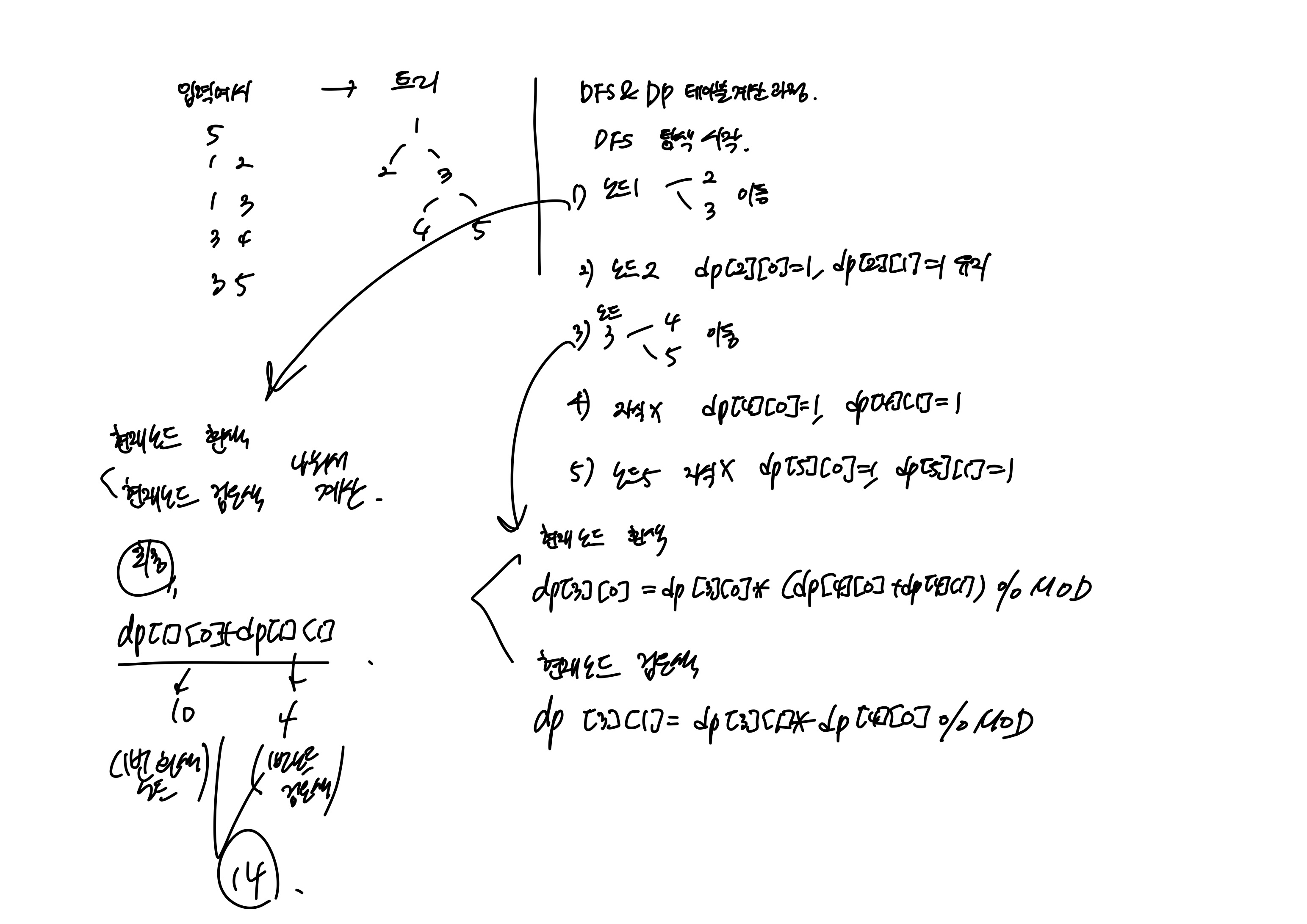 dp[u][1]은 노드 u가 검은색일 때 서브트리의 가능한 색칠 경우의 수.DFS로 트리 탐색 및 DP 계산: 루트에서부터 DFS(깊이 우선 탐색)를 사용하여 각 노드의 DP 값을 계산.