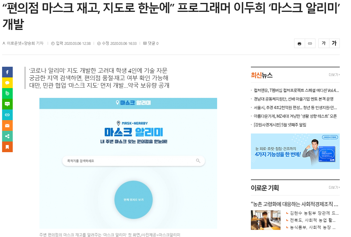 이러한 대란을 막기 위해 지역별/약국별 마스크 재고 현황을 알려주는 서비스가 빛을 발했었다.