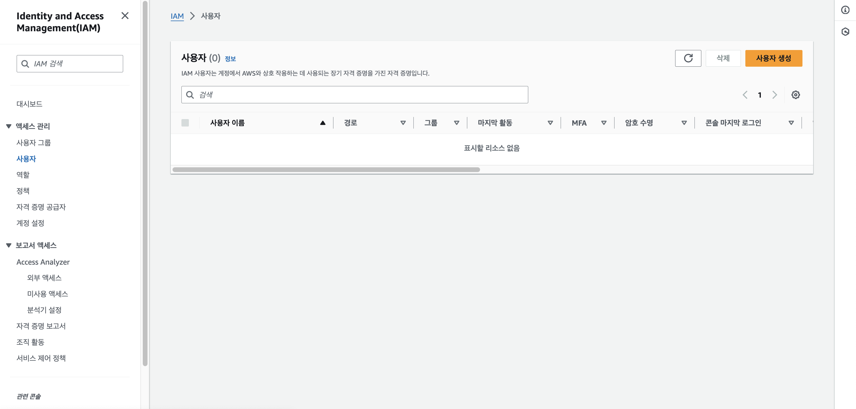 IAM 대시보드로 화면을 이동 후 왼쪽에 사용자를 선택한다.