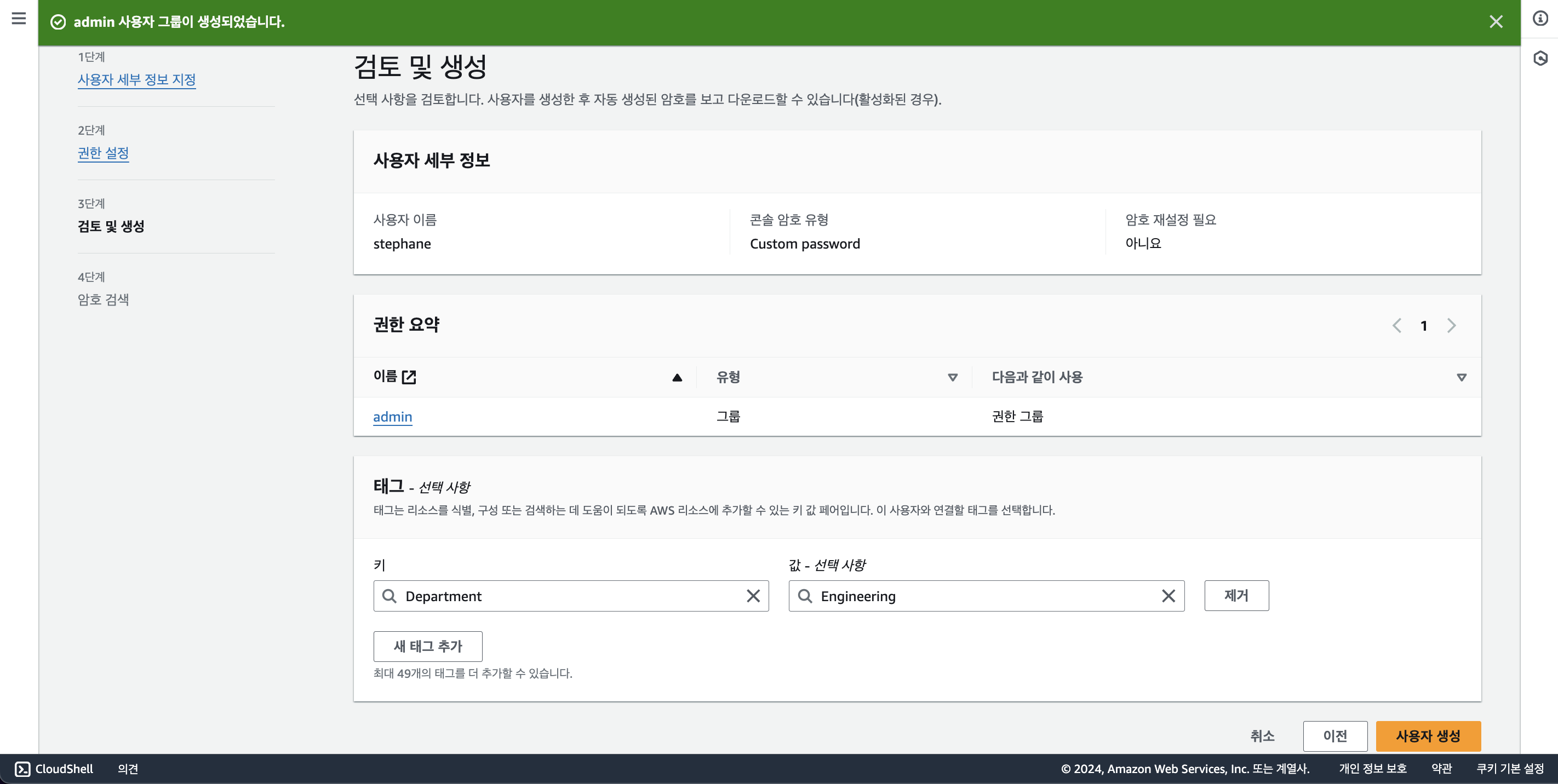 확인 후 사용자 생성 버튼을 누른다.