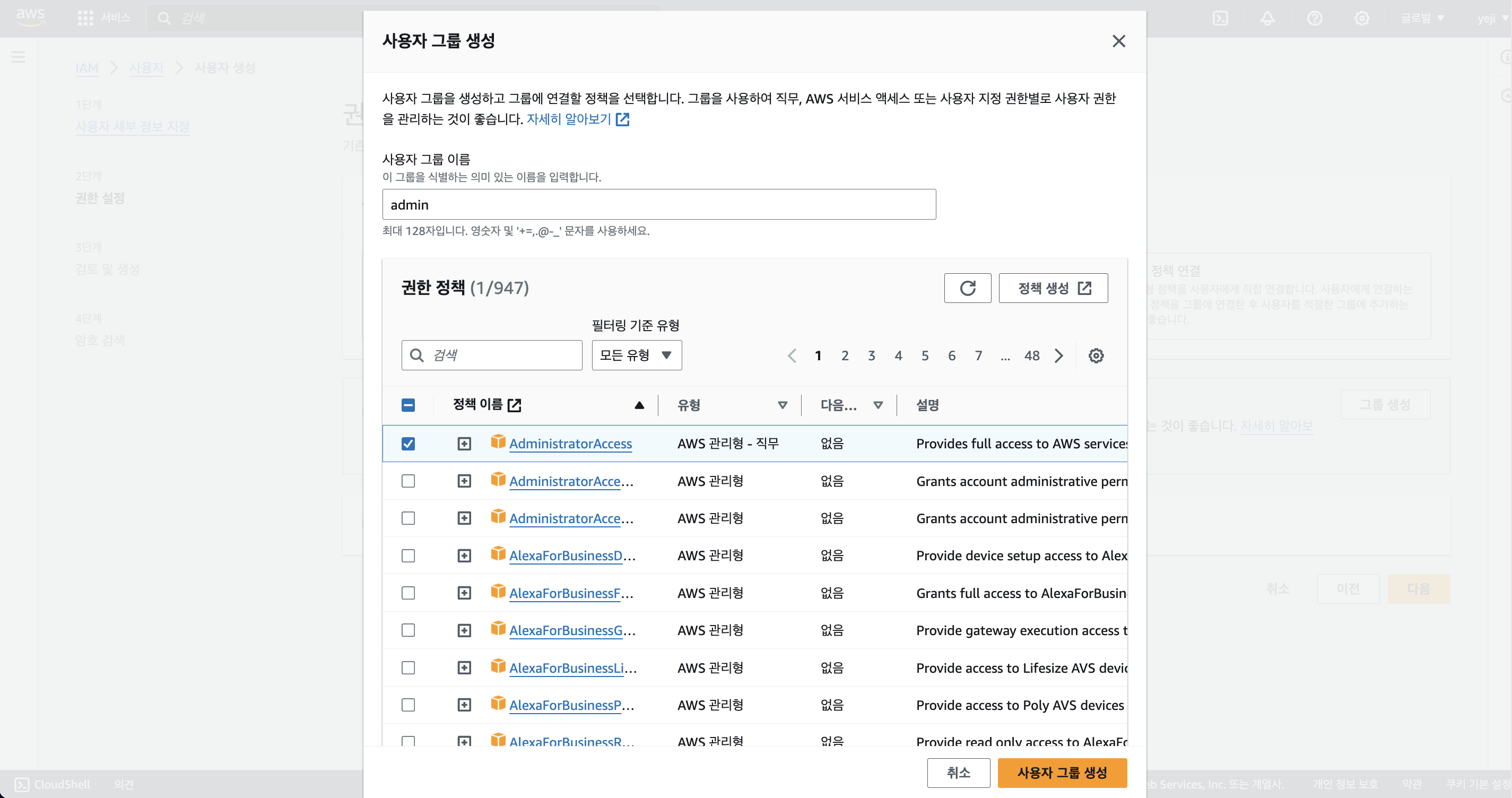 ( 사용자 그룹 생성 방법 : 그룹 생성 버튼 -> 사용자 그룹 이름 및 정책 선택 후 사용자 그룹 생성 )