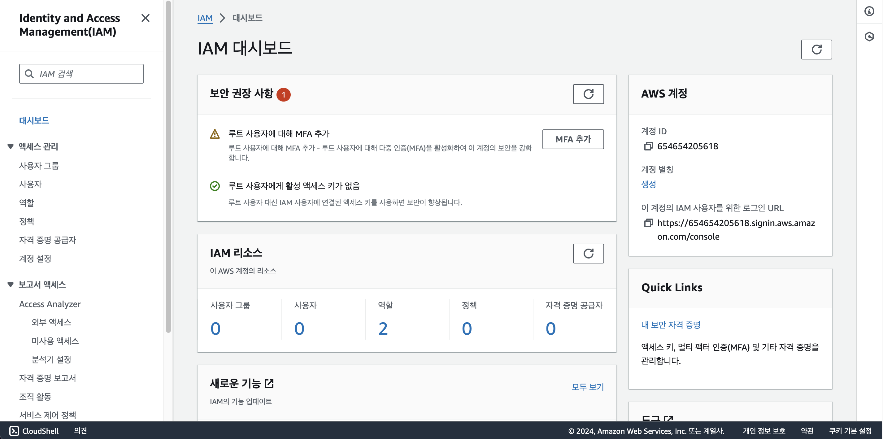 | MFA 관리 | - 추가 인증 수단인 MFA(Multi-Factor Authentication) 을 통해 계정 보안 강화 - 다단계 인증, 다요소 인증을 도입 가능 (다단계 인증 : 종류를 따지지 않고 2번 이상 인증) (다요소 인증 : 두 종류 이상의 인증(ID와 암호, 전용 하드웨어, 생체 인증)을 사용) |