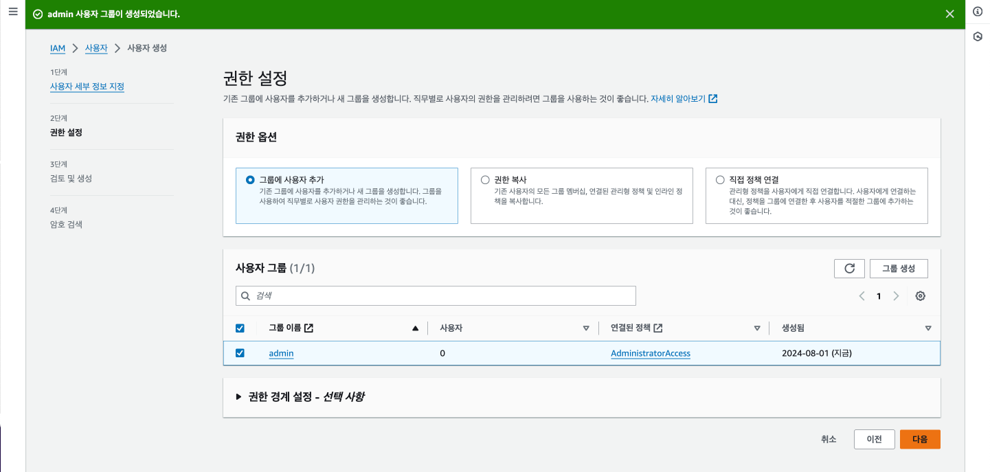 사용자 그룹을 체크한 후 다음 버튼을 누른다.