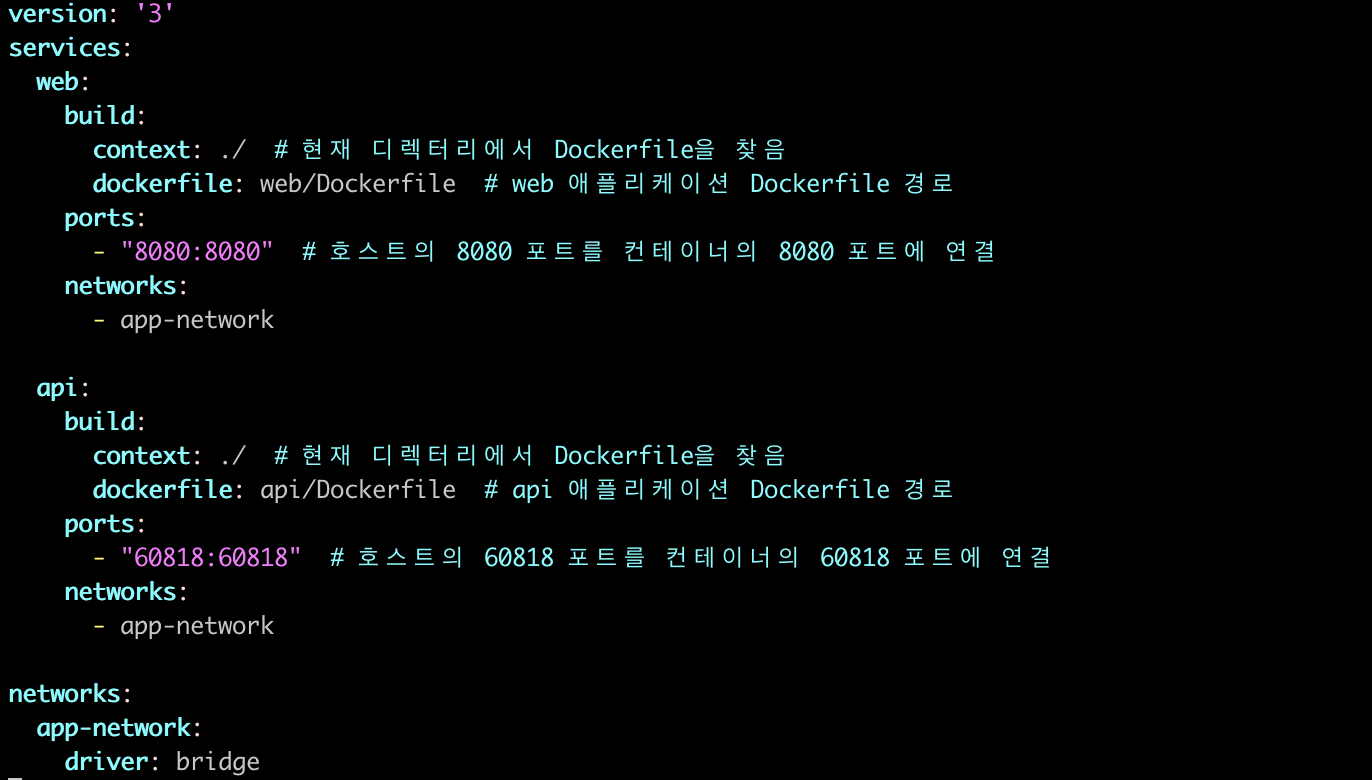 web 서비스는 호스트의 8080 포트를, api 서비스는 60818 포트를 컨테이너의 포트에 연결하여 외부에서 접근할 수 있도록 합니다.