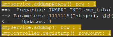 log.debug(CC.YE + "EmpService.addEmp() row : " + addEmpRow + CC.RESET);