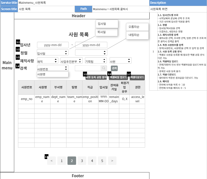 <!-- 입사일과 퇴직일에 따라 오름차순/내림차순 -->