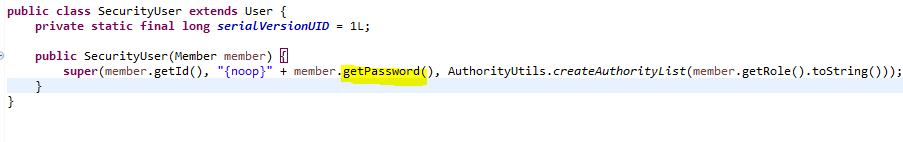 super(member.getId(), member.getPassword(), AuthorityUtils.createAuthorityList(member.getRole().toString()));
