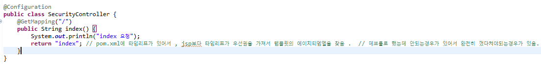 1.pom.xml에 Thymeleaf 의존성이 있으면 .html이 .jsp보다 우선 처리됨