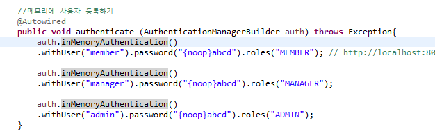 이렇게 직접 inMemoryAuthentication()을 설정하면,
