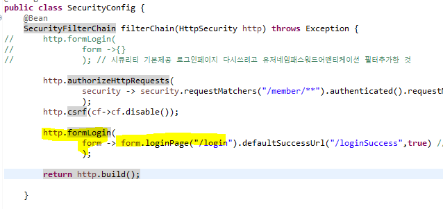 시큐리티 필터체인을 내가 @Congifuration 등록하면 UsernamepasswardAuthentication 이건 기본필터가 아니라 사라짐. 그래서 http.formLogin(form -> 이런식으로 내가 설정해줘야함.
