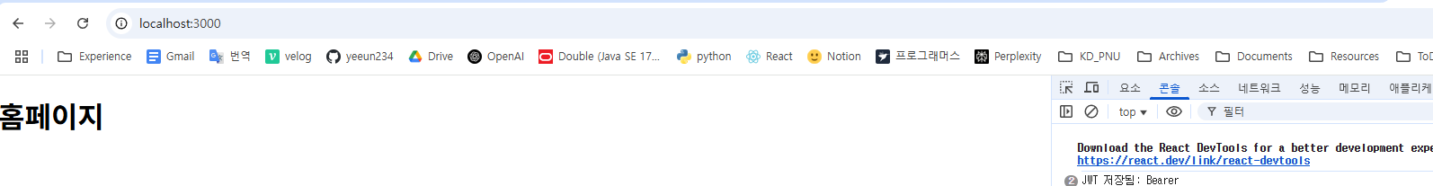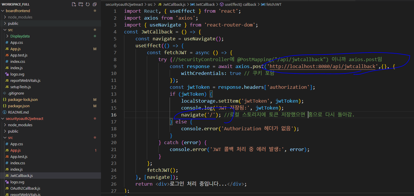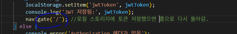 response.sendRedirect("http://localhost:3000/oauth2/callback");response.setHeader(HttpHeaders.AUTHORIZATION, jwtToken);/oauth2/callback 경로에 `` 컴포넌트가 매핑됨JwtCallback.js에서 백엔드에 토큰 요청 → 토큰 저장 → navigate('/')로 홈으로 이동JwtCallback 컴포넌트가 마운트되자마자 useEffect에서 토큰 요청 후navigate('/')로 홈으로 이동합니다.로그인 처리 중입니다...가 화면에 거의 보이지 않고/ 경로에 바로 `같은 컴포넌트를 매핑해두었다면 navigate('/')`가 실행되면서 즉시 홈 컴포넌트가 렌더링됩니다.} />가/oauth2/callback에 잠깐 들어왔다가/(홈)으로 이동한 상태입니다.예시: