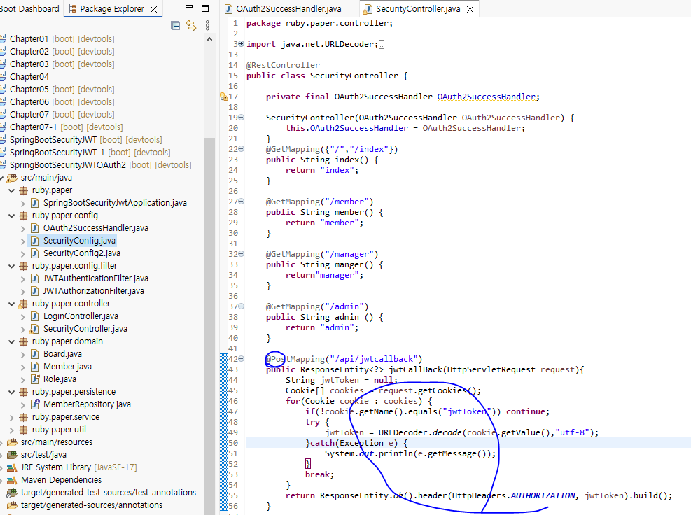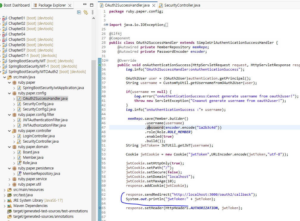 이때 백엔드 SecurityController 클래스의 이 메소드가 실행되어서 쿠키랑 토큰이랑 헤더에 다 담김