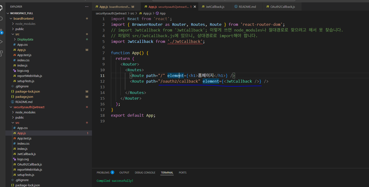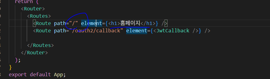 그럼 3000번대 포트 App.js가 실행되고 여기에 있는 코드인 <Route path="/oauth2/callback" element={} /> 이거 실행.