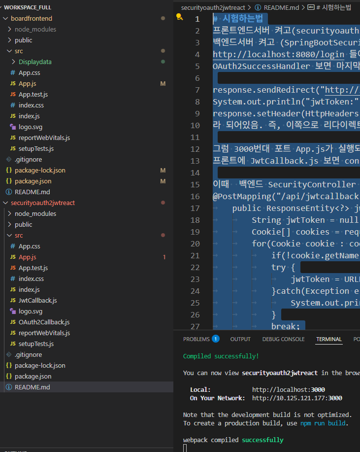 프론트엔드서버 켜고(securityoauth2jwtreact) npm start