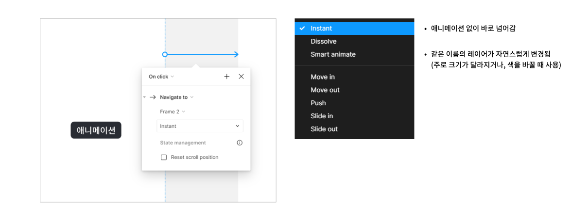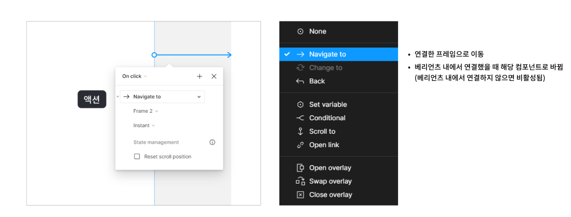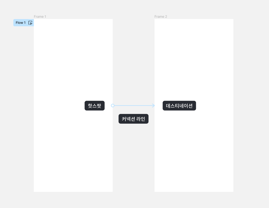 화면과 화면을 연결시켜 특정 버튼이나 영역을 눌렀을 때 어떤 인터랙션 스타일로, 어떤 화면으로 이동할건지 보여주는 기능