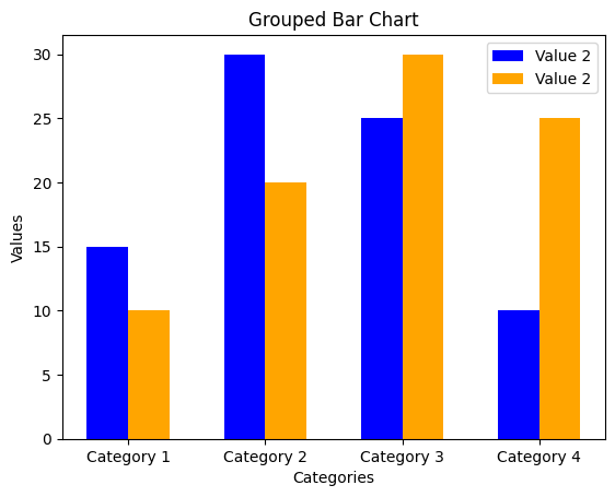 plt.bar(x_grouped + width/2, values2_stacked, width=width, label='Value 2', color='orange')