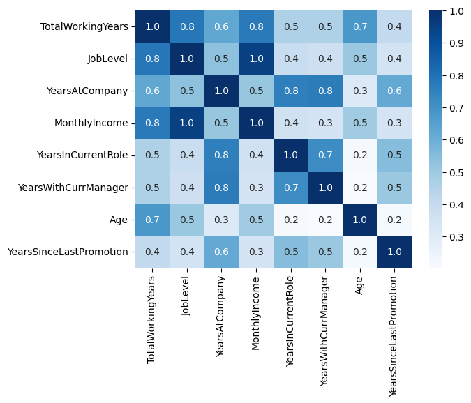sns.heatmap(cor_df2, annot=True, fmt='.1f', cmap='Blues')