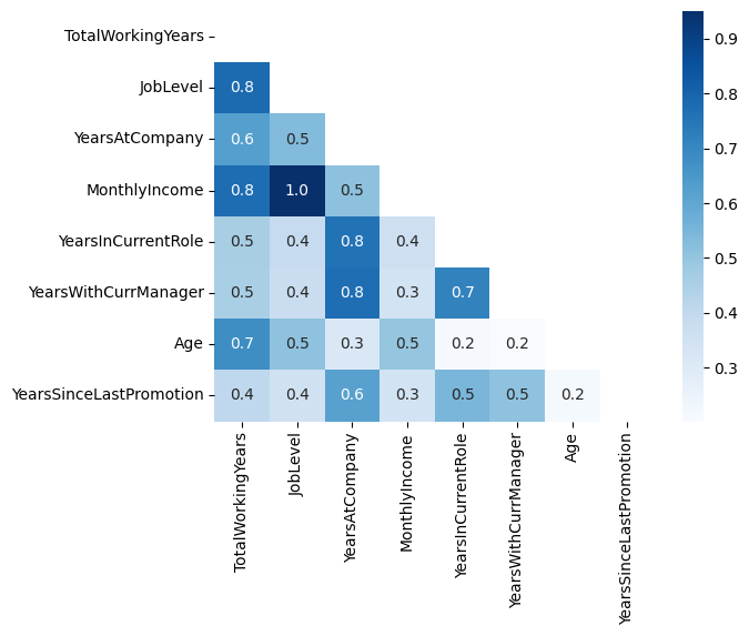 sns.heatmap(cor_df2, annot=True, fmt='.1f', cmap='Blues', mask=mask)