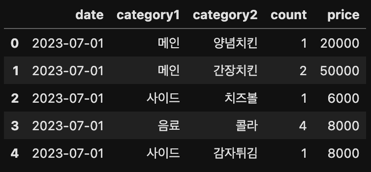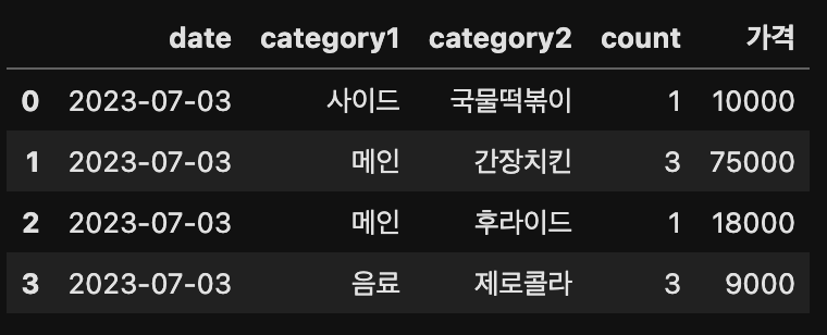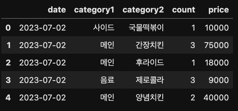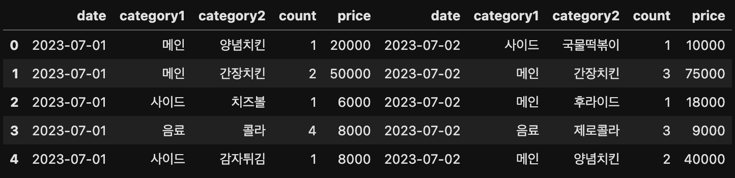 위와 같이 두 개의 데이터프레임인 'sales_day1'과 'sales_day2'를 수평으로 합친다. pd.concat()
