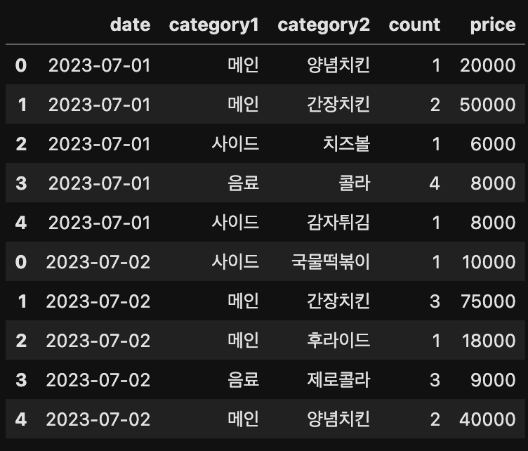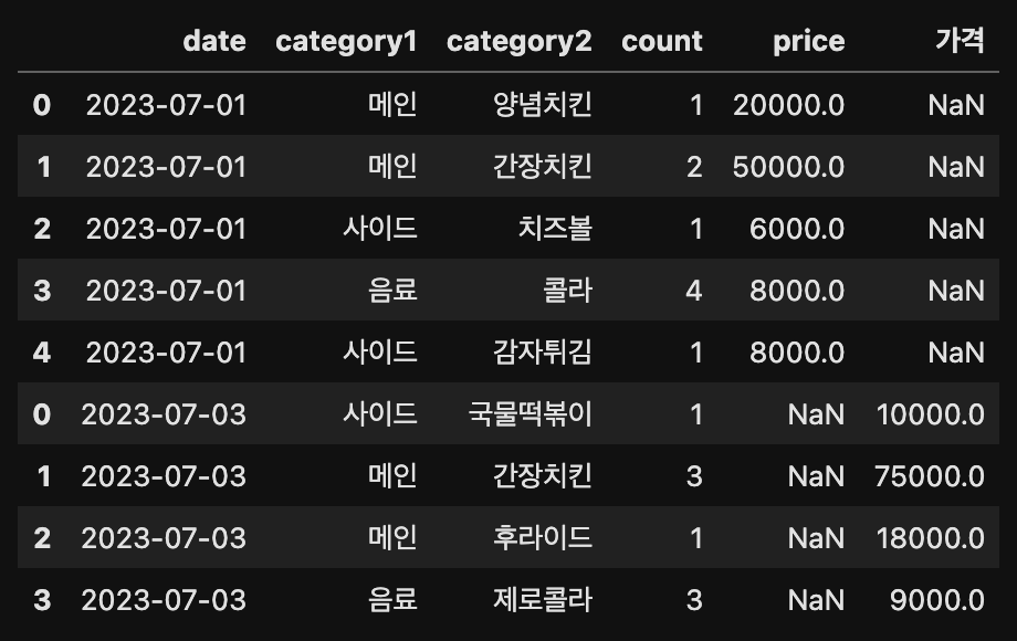 따라서 위의 두 코드 모두 동일한 결과를 반환하며 결과적으로는 'sales_day1'의 아래에 'sales_day2'가 붙은 형태의 새로운 데이터프레임이 생성된다.