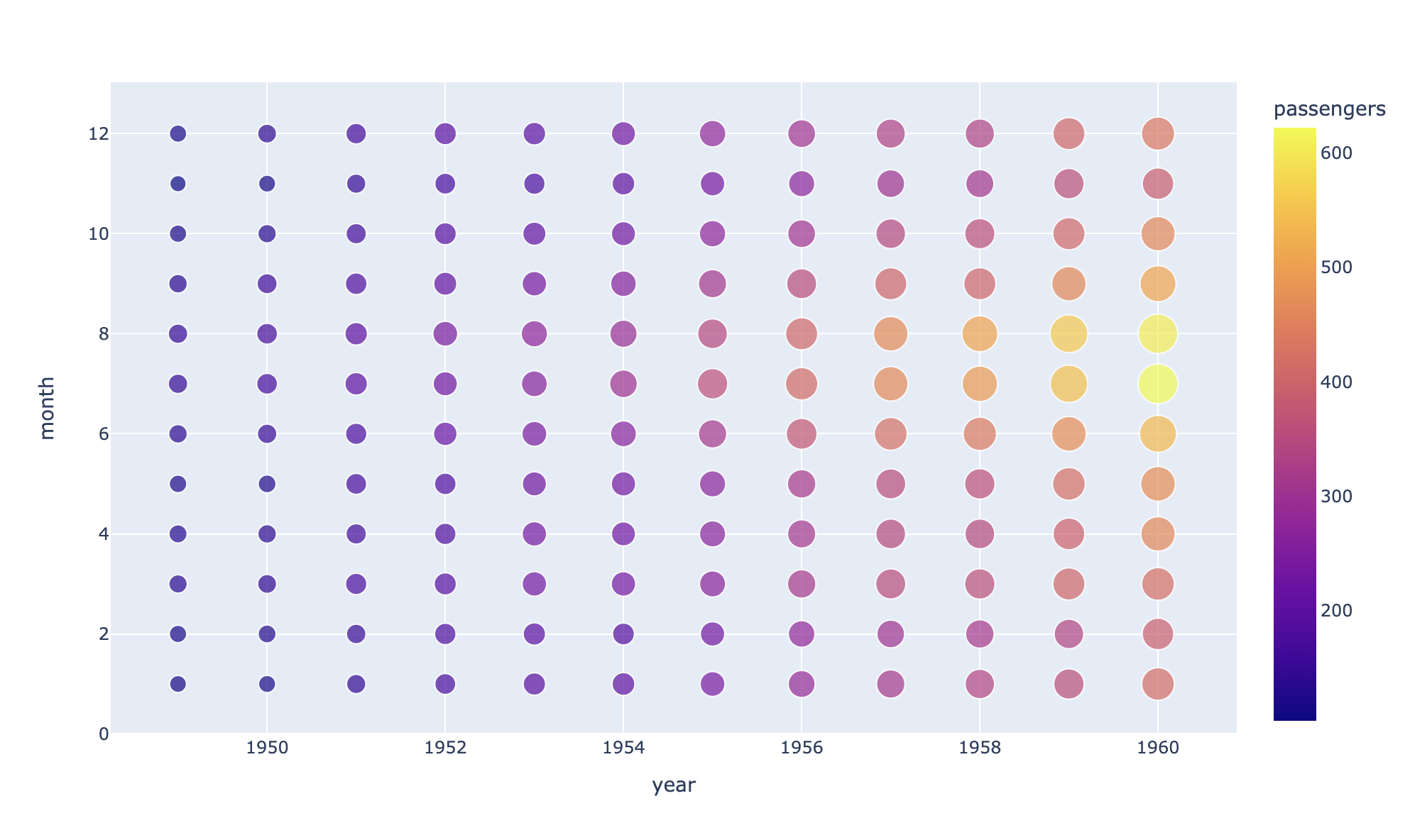 fig = px.scatter(df, x='year', y='month', color='passengers', size='passengers')