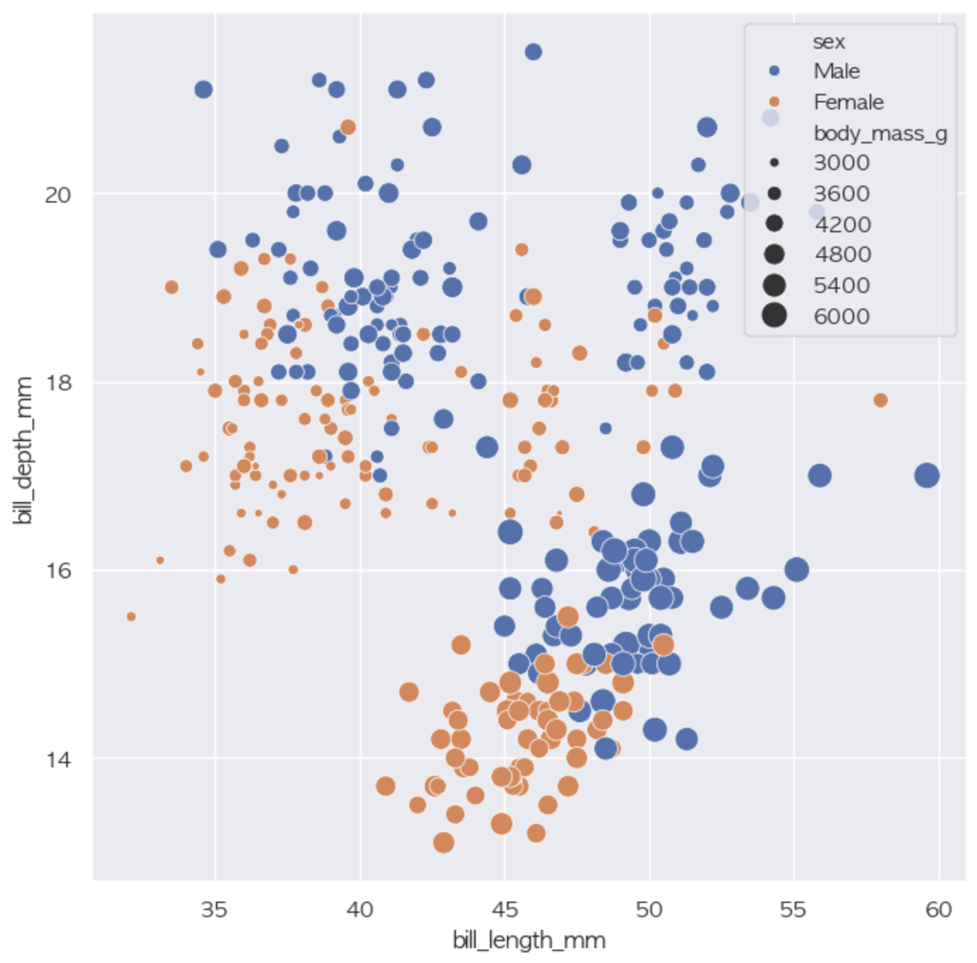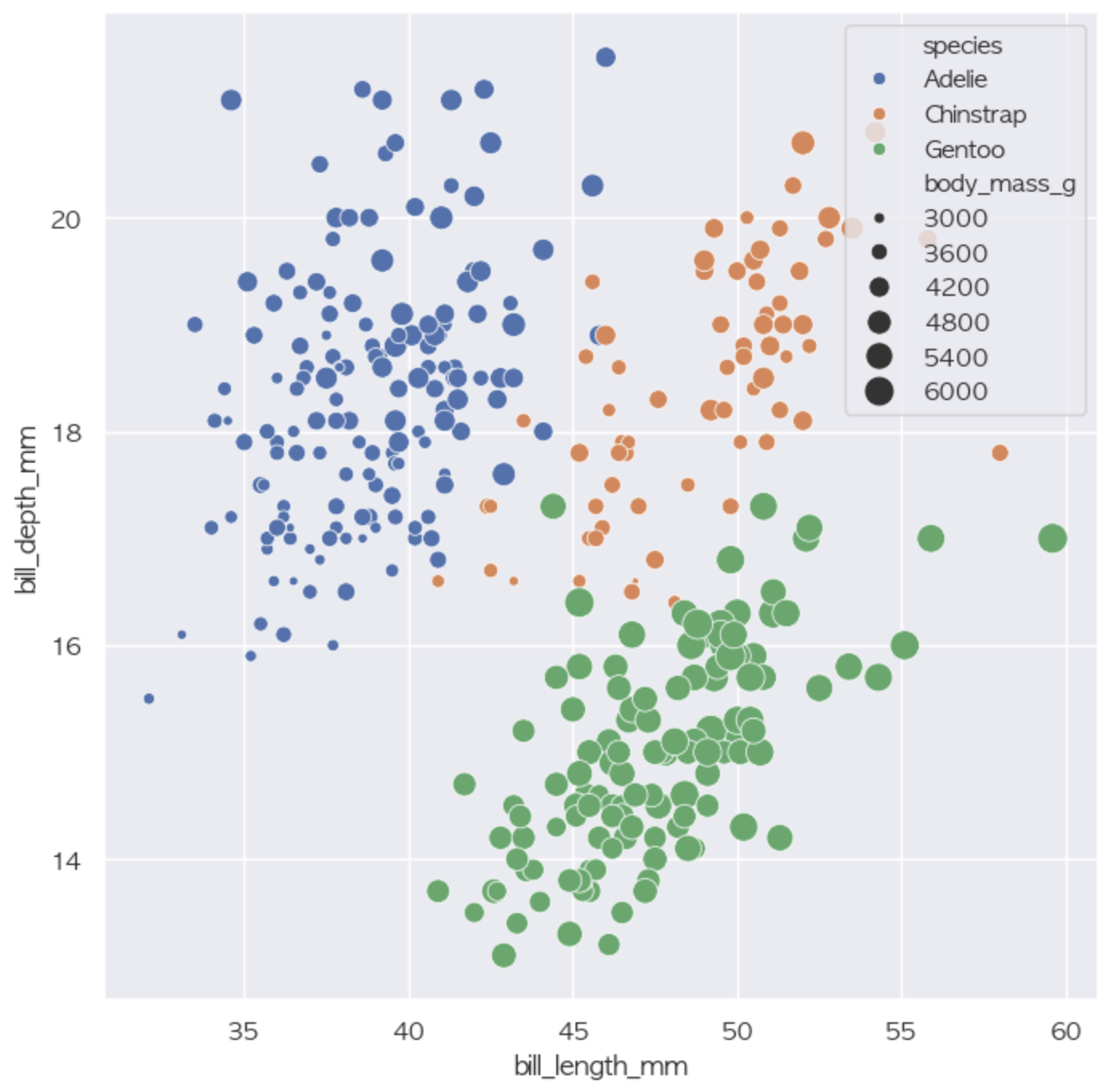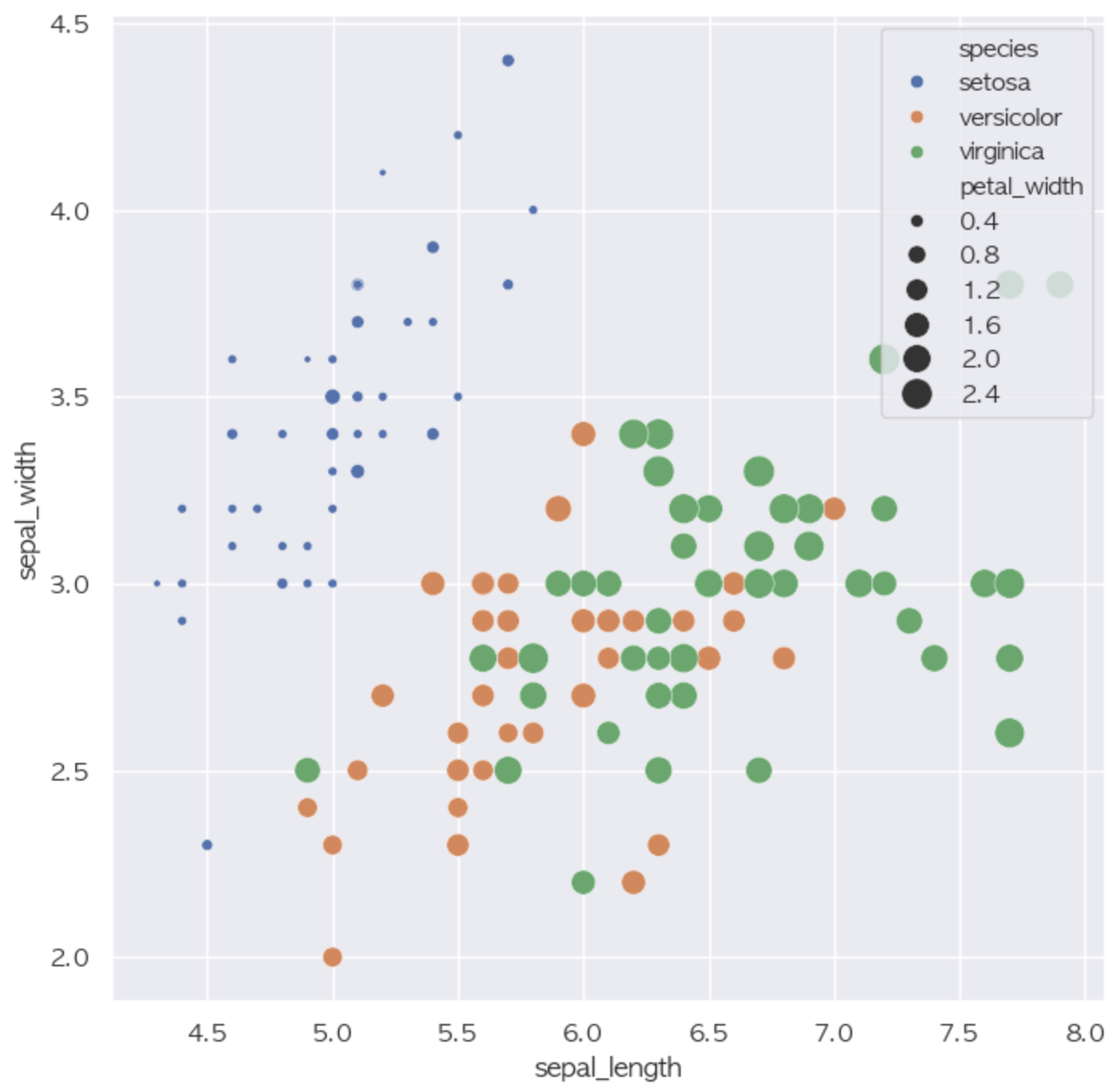 seaborn.scatterplot(data=None, x=None, y=None, hue=None, size=None, sizes=None, legend='auto')