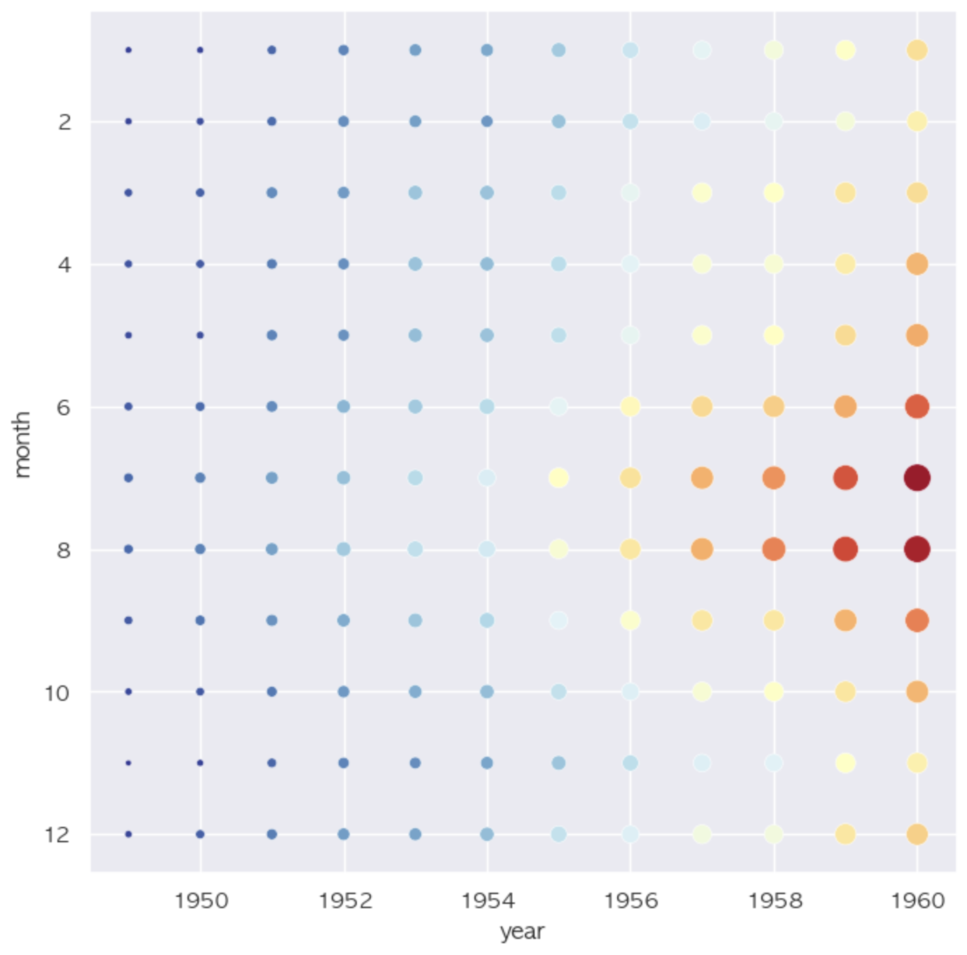 sns.scatterplot(data=df, x='year', y='month', hue='passengers', size='passengers', sizes=(10, 200), legend=False, palette='RdYlBu_r')