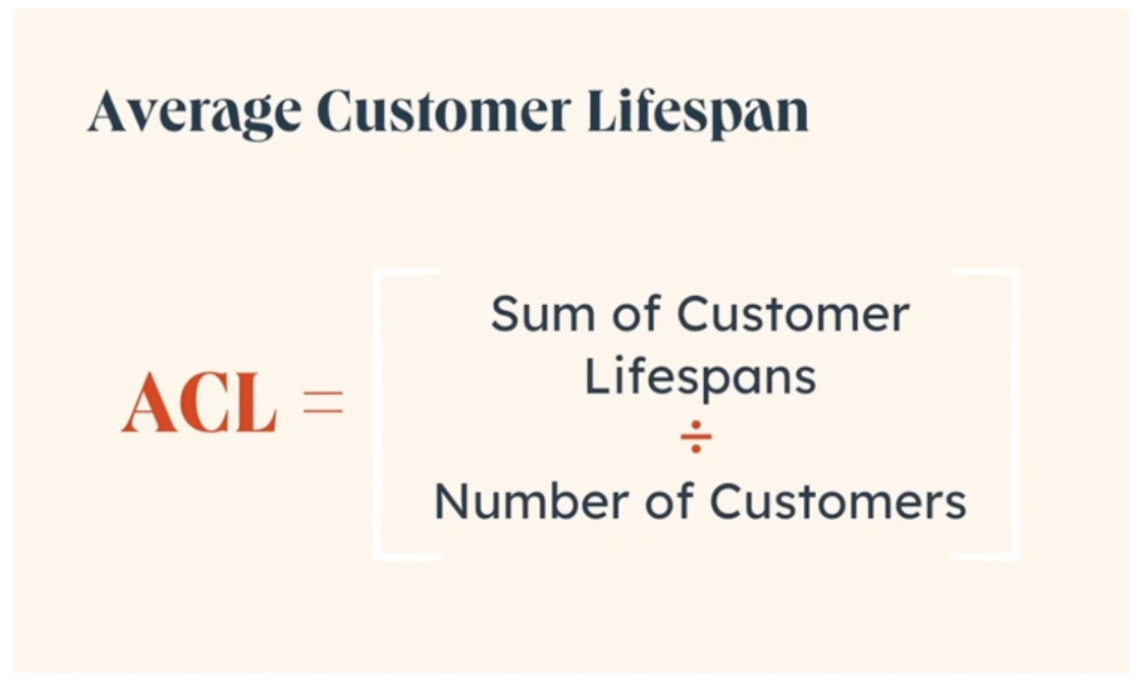 평균 고객 수명 (ACL) = 전체 고객들의 수명 합 (Sum of Customer Lifespans) / 전체 고객 수 (Number of Customers)