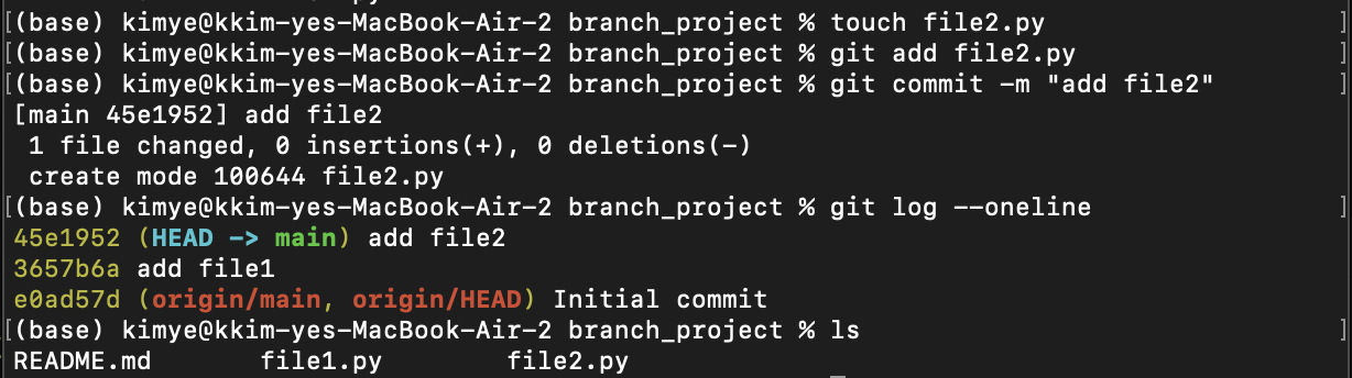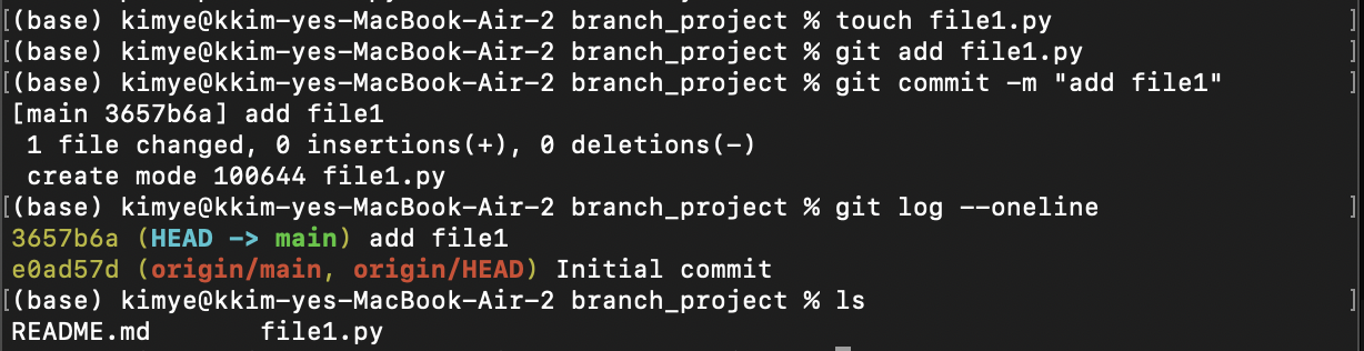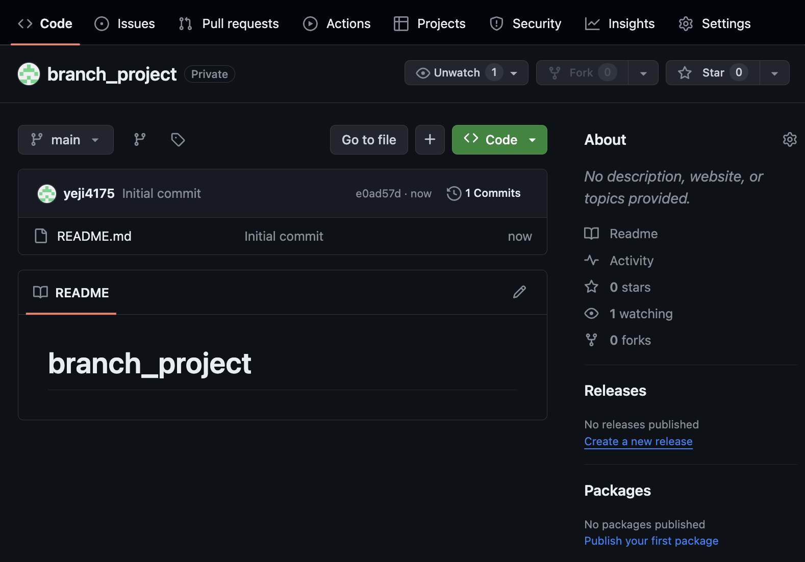 main branch가 remote repository에 잘 배포되었는지 확인을 하고 싶으면 GitHub의 branch_project를 새로고침하면 된다. 그럼 local repository 상태가 반영이 된걸 확인할 수 있다.