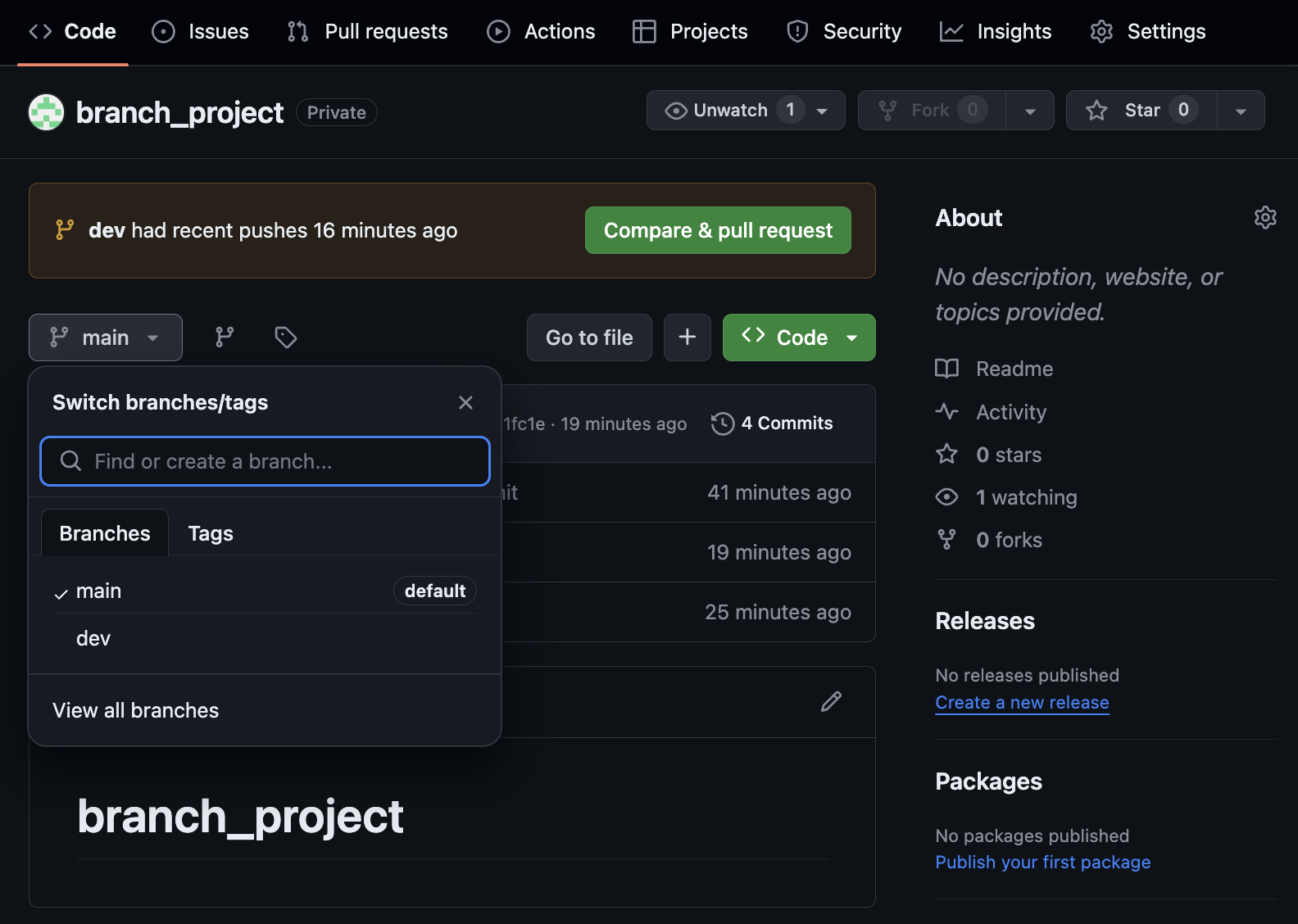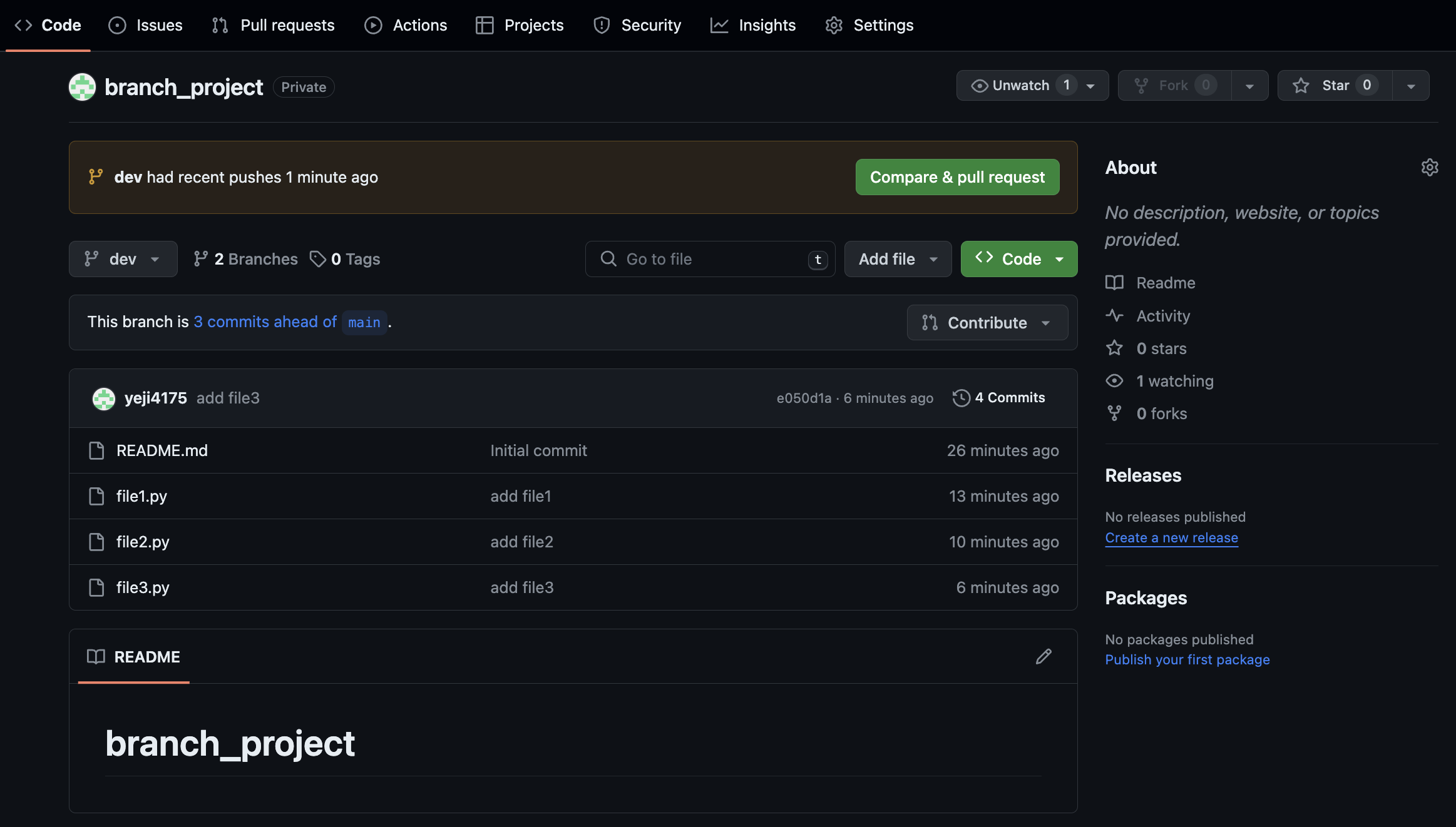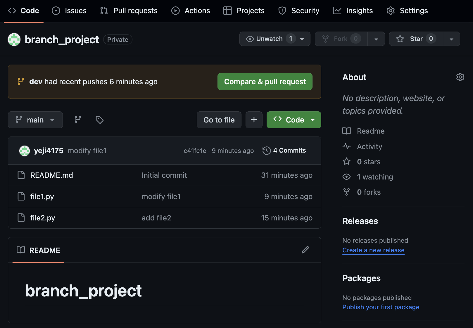 GitHub를 새로고침하면 branch_project에서 dev가 잘 배포된걸 확인할 수 있다.