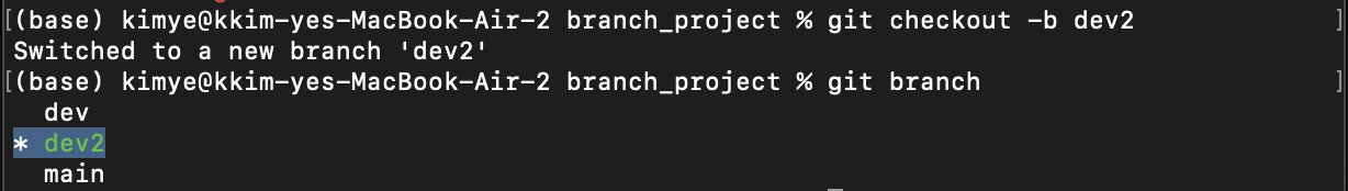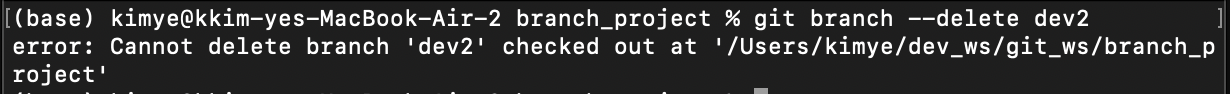하지만 위의 이미지와 같이 에러가 뜬다. 이 에러는 dev2 branch에서 dev2를 삭제가 안되니 다른 branch로 이동 후 삭제하라는 뜻이다.