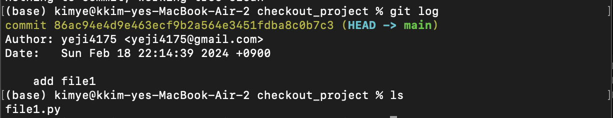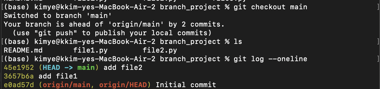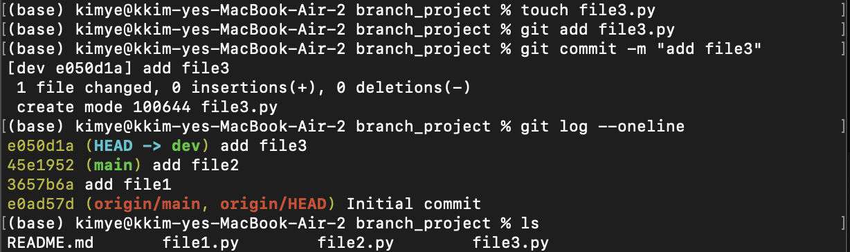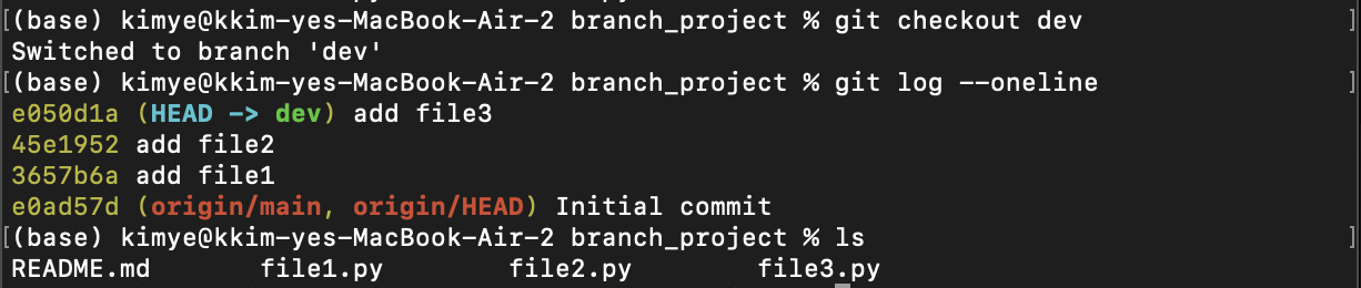 4.6에서 file3.py를 추가했지만 main branch로 이동했기에 file3.py이 보이지 않는다.
